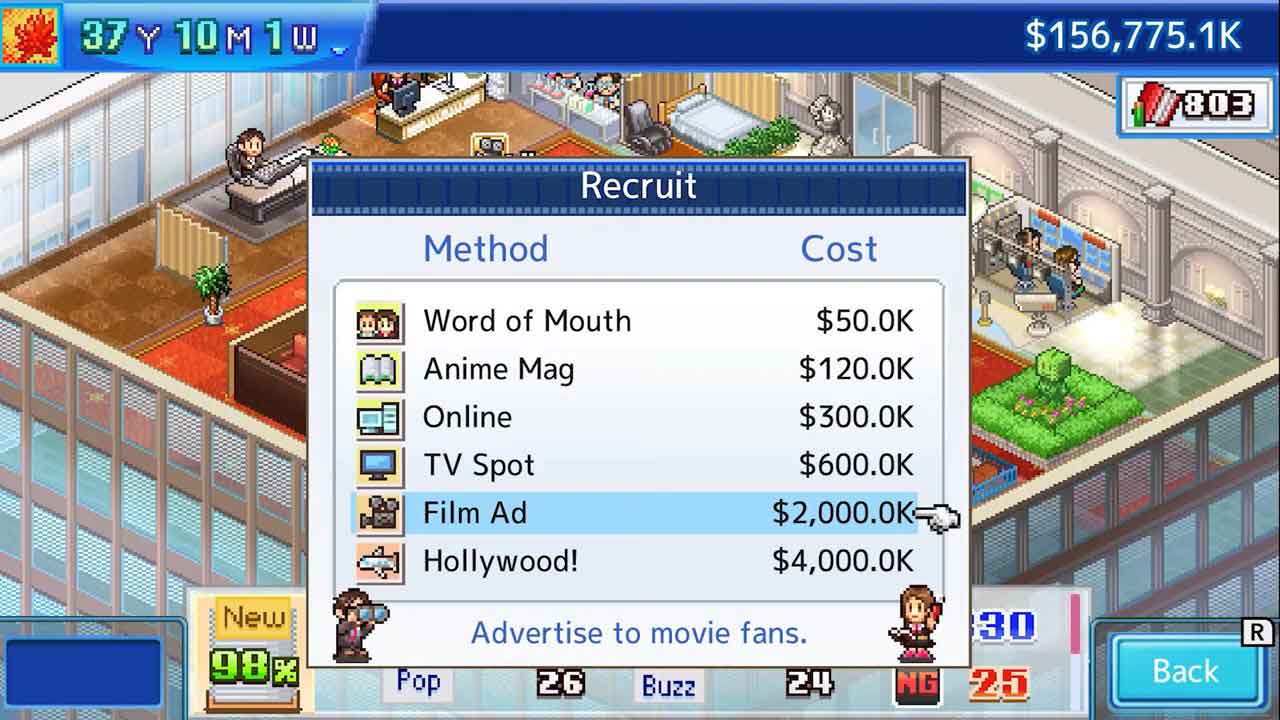หากต้องการสร้างสตูดิโอที่ประสบความสำเร็จ ก่อนอื่นให้ลองจ้างพนักงาน คุณสามารถสร้างรายได้จากการแสดงที่คุณทำ แต่ก่อนอื่นคุณอาจต้องการทำสิ่งต่างๆ เช่น สร้างรายการยอดนิยมเพื่อฝึกอบรมพนักงานของคุณไปพร้อมๆ กับประหยัดเงิน แม้ว่าตัวเกมจะทำรายละเอียดในด้านแอนิเมชั่นมาเพียงพอแล้ว รวมถึงเหตุการณ์สุ่มและแท็กการตั้งค่าที่สอดคล้องกับธีมแอนิเมชั่นมากกว่า แต่ในแง่ของรูปแบบการเล่น เกมนี้เทียบได้กับประเภทที่คล้ายกัน เช่น “Game Dev Story”