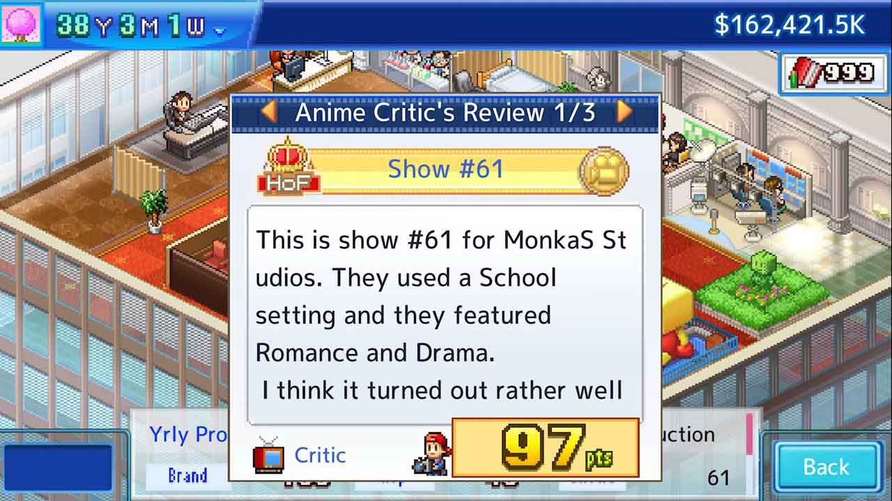 แม้แต่การผลิตทั้งหมดที่แสดงในเกมนี้ก็ยังไม่ถูกต้อง ไม่ใช่ว่าคุณจะได้รับค่าตอบแทนมากเท่ากับการดู จริงๆ แล้วสตูดิโอแอนิเมชั่นได้รับผลกำไรเพียงเล็กน้อยจากผลิตภัณฑ์ของตน มีหลายบทความที่อธิบายว่าสถานการณ์ของพวกเขาเลวร้ายเพียงใด ประการที่สองบางส่วนได้รับการออกแบบอย่างเกียจคร้านเช่นถ้าคุณต้องการเปลี่ยนงานของพนักงานคุณต้องใช้เงินจำนวนมากเพื่อซื้อสถานที่เช่าที่เรียกว่า “ห้องทำงาน” … ทำไมผู้เล่นถึงช้าขนาดนี้ ค่าใช้จ่าย? ตัวเลือกนี้สามารถอยู่ในเมนูได้เนื่องจากผู้เล่นต้องการเปลี่ยนงานเมื่อใดก็ได้
