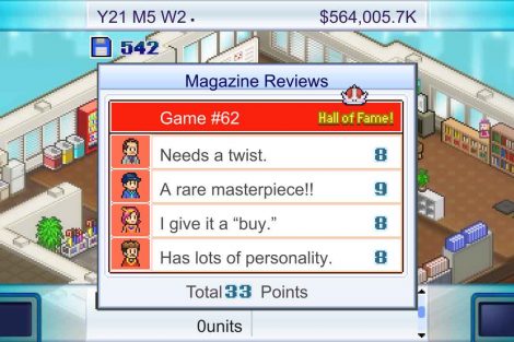 ด้วยเพลงซ้ำๆ ง่ายๆ ที่ให้ความรู้สึก “เล่นอีกครั้ง” ได้อย่างง่ายดาย ฉันขอแนะนำเกมนี้โดยคำนึงถึงอันตรายที่อาจทำให้คุณหลงใหลหรือทำให้คุณเบื่อได้ในเวลาน้อยกว่า 1 ชั่วโมง (แต่ก็อาจทำให้เบื่อได้หลังจาก 5 ชั่วโมงเช่นกัน) เชี่ยวชาญโลกแห่งเกมแล้วคุณจะล้มเหลวไม่ได้อีกต่อไป) หากคุณเพลิดเพลินกับประสบการณ์ของเกมจำลองสถานการณ์ Game Dev Story จะทำให้คุณได้รับช่วงเวลาที่ยอดเยี่ยมอย่างแน่นอน