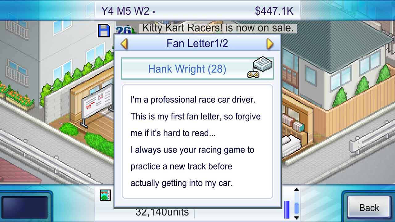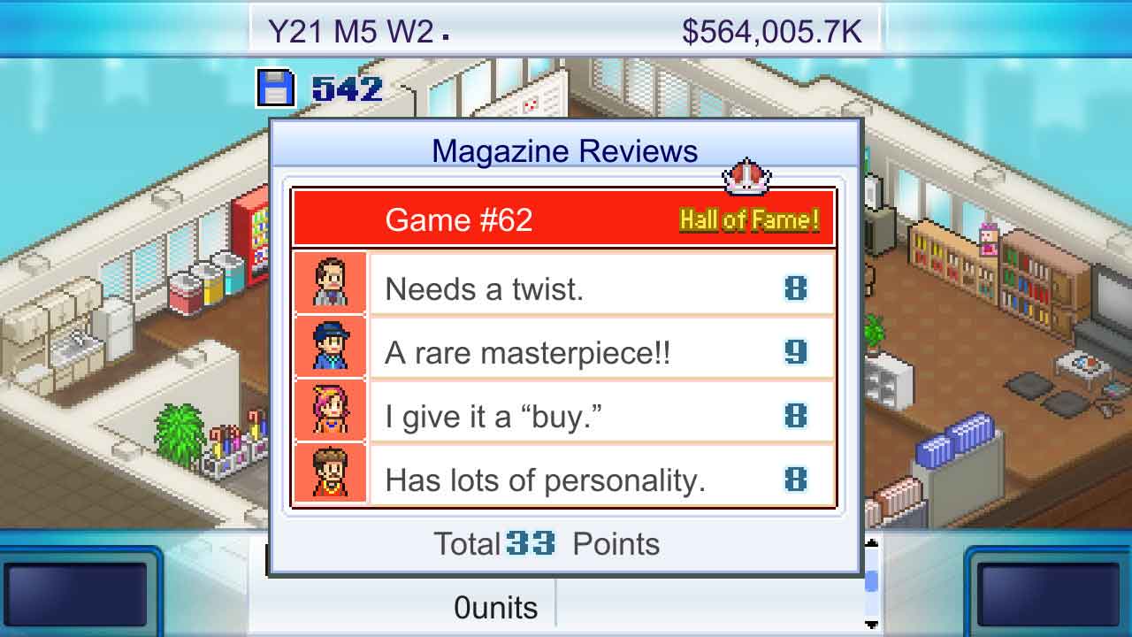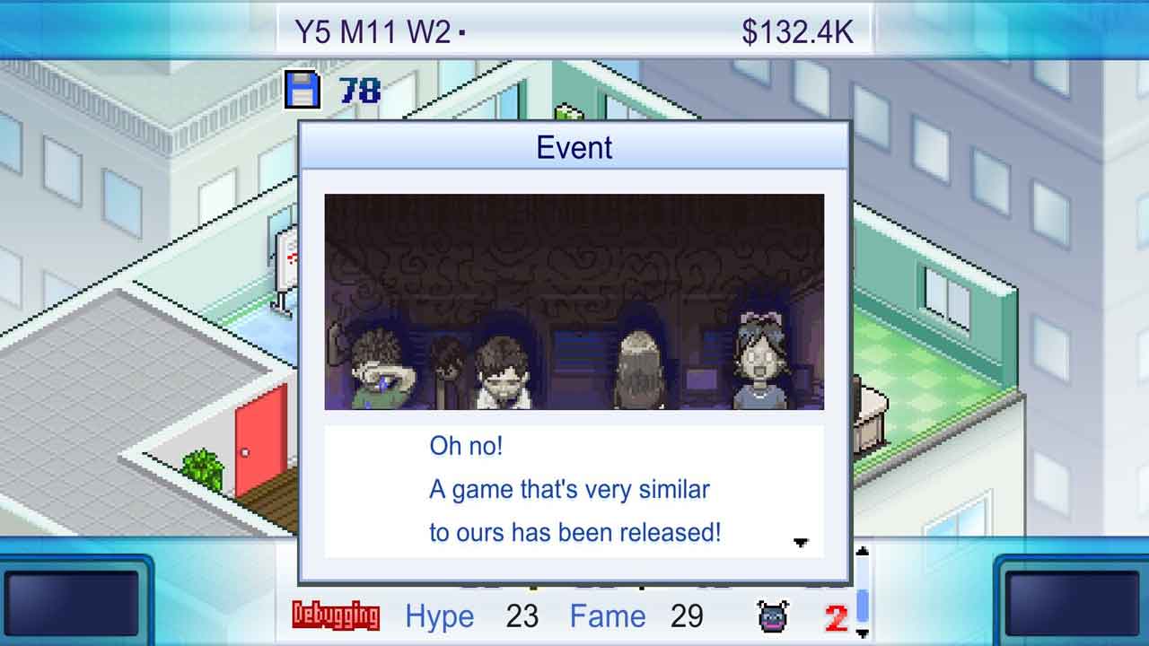 ในแง่ของรูปแบบการเล่น Game Dev Story ไม่ได้แตกต่างจากเวอร์ชันมือถือมากนัก และไม่มีการปรับปรุงองค์ประกอบด้านคุณภาพชีวิตอย่างมีนัยสำคัญ ที่ฉันพูดแบบนี้เพราะฉันเคยเล่นเกมนี้มาก่อนบนมือถือและบนพีซีด้วย โดยพื้นฐานแล้วมันจึงเป็นเกมผู้ประกอบการพัฒนาเกม (คล้ายกับแฟรนไชส์ผู้ประกอบการ) ซึ่งเป็นประเภทที่นักพัฒนาเกมอินดี้มักจะขายสำเนามากกว่าบริษัท AAA เนื่องจากราคาที่เข้าถึงได้ง่ายกว่า มันเป็นเกมง่ายๆ ที่คุณเปิดสำนักงานพัฒนาเกม และแน่นอนว่าคุณมีเงินและสิ่งปลูกสร้างอยู่แล้ว ทำไม เพราะโดยพื้นฐานแล้วคุณมาจากครอบครัวที่ร่ำรวย สิ่งหนึ่งที่ฉันชื่นชมคือเกมได้รับอิทธิพลจากการพัฒนาเกมของญี่ปุ่นอย่างไร โดยคำนึงถึงปัจจัยต่างๆ เช่น การอัปเดตคอนโซล ตลาดปัจจุบัน และคอนโซลใดบ้างที่ต้องพัฒนาเกมเพื่อสร้างผลกำไร