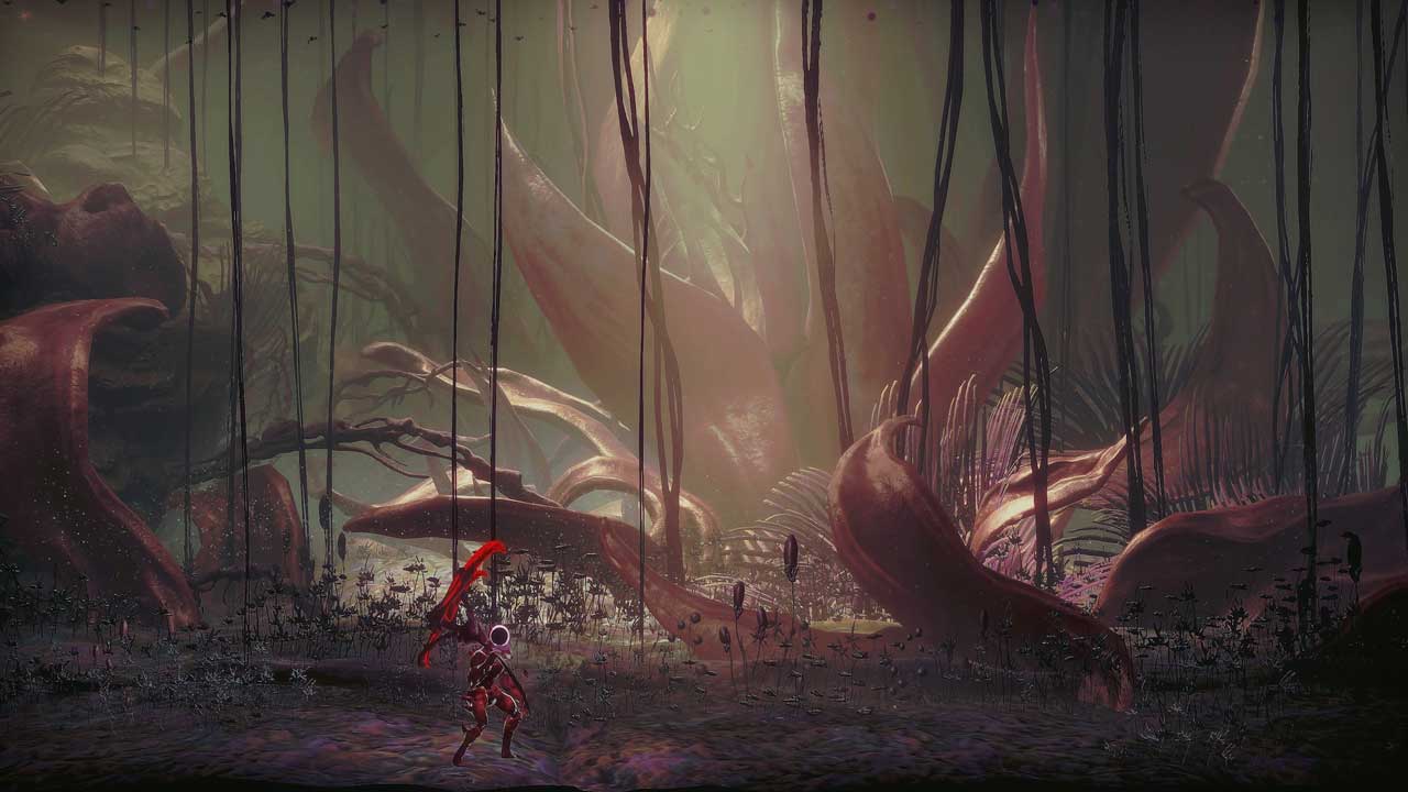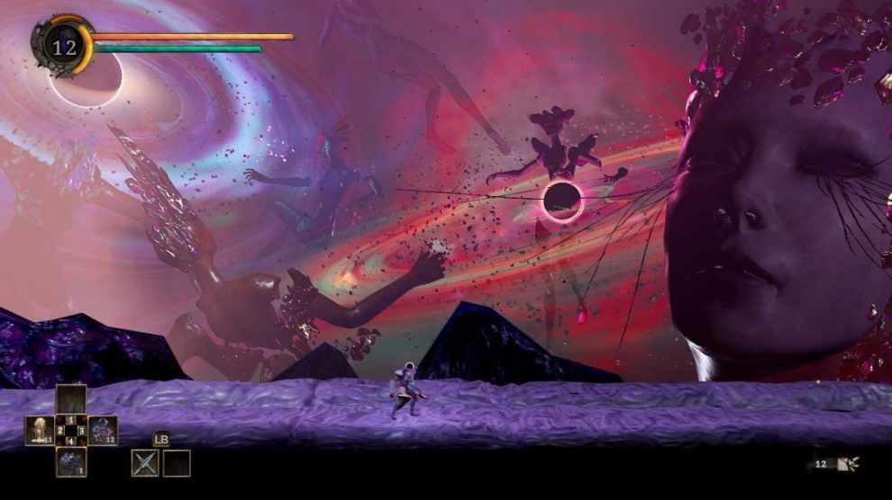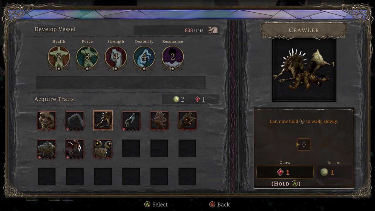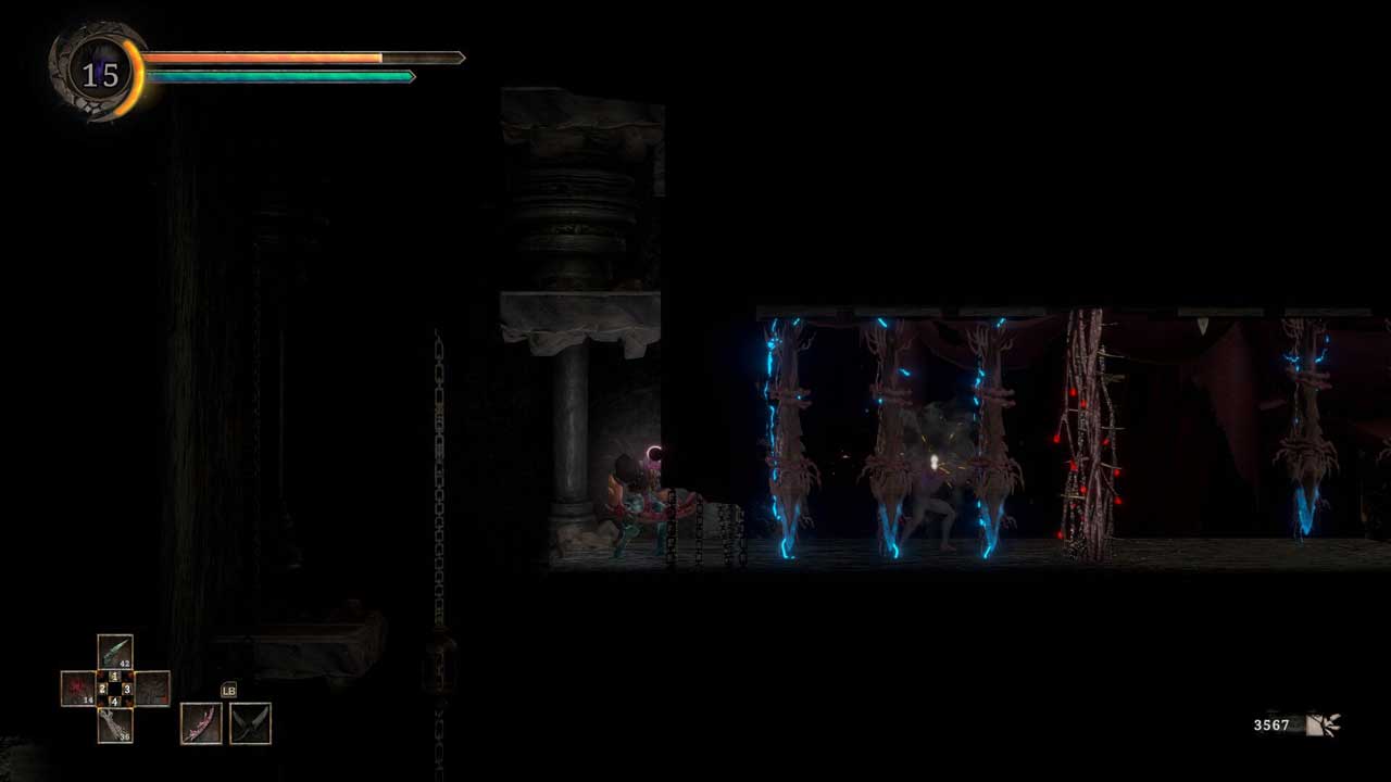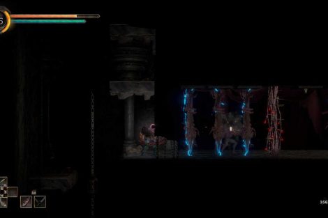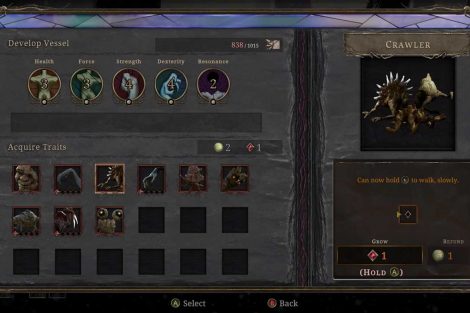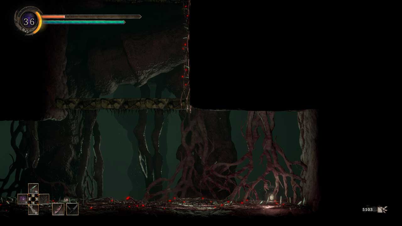 แถบพลังชีวิตของศัตรูจะแบ่งออกเป็นส่วนสีแดงและสีเทา หากคุณต่อสู้กับศัตรูในขณะที่แถบพลังชีวิตเป็นสีเทา มันจะกลายเป็นการขับไล่และถูกรบกวนในช่วงเวลาสั้นๆ แต่ถ้าคุณปัดป้องในขณะที่สุขภาพของพวกเขาเป็นสีแดง มันก็จะกลายเป็น Absorb ซึ่งมีพลังมากกว่ามาก ด้วยการดูดซับศัตรู คุณจะดูดแถบพลังชีวิตทั้งหมดทันที และ Absorbs ที่ประสบความสำเร็จสี่ตัวจะให้การรักษาแก่คุณ โดยทำหน้าที่เหมือนกับ Estus Flask ส่วนหนึ่งของ GRIME ที่ค่อนข้างน่าผิดหวังก็คือแพลตฟอร์ม มันไม่ได้แย่ แต่อย่างใด แต่มันก็ค่อนข้างแข็งและเทอะทะซึ่งเป็นเรื่องน่าเสียดายสำหรับเกมแพลตฟอร์ม metroidvania ระบบอัพเกรดของเกมก็ไม่น่าสนใจเท่าที่ควร สำหรับผู้เล่นยุคแรก ระบบอัปเกรดทั้งหมดมีเพียงสามคุณลักษณะที่สามารถอัปเกรดได้ เช่น ชีวิต ความแข็งแกร่ง (แถบสีน้ำเงิน) และอื่นๆ คุณสมบัติอื่นๆ นั้นโดยพื้นฐานแล้วเป็นทางเลือกของผู้เล่น