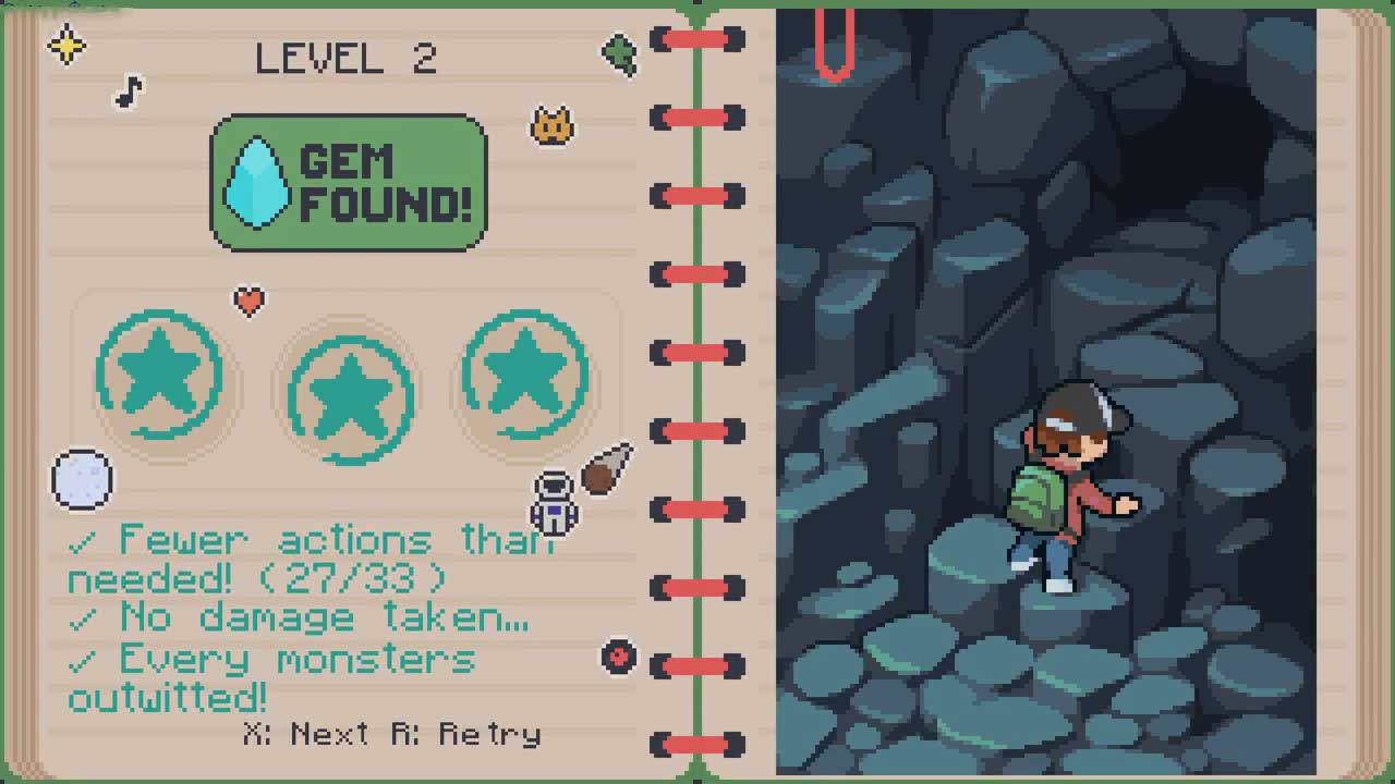แต่ละระดับของ Prune & Milo มีอัญมณีสีน้ำเงินพิเศษให้รวบรวม (เช่นเดียวกับอัญมณีที่มีขนาดเล็กกว่า) และคุณจะได้รับ 3 ดาว หนึ่งดวงสำหรับการจบการเคลื่อนไหวที่ต่ำกว่าที่อนุญาต หนึ่งดวงสำหรับการเอาชนะสัตว์ประหลาดทั้งหมด และอีกหนึ่งดวงสำหรับการไม่ได้รับความเสียหาย คุณต้องรวบรวมอัญมณีสีน้ำเงินเกือบทั้งหมดเพื่อจบเกมอย่างถูกต้อง แต่ดวงดาวนั้นมีไว้เพื่อความพึงพอใจของคุณ ซึ่งเหมาะสำหรับทั้งผู้ชื่นชอบปริศนาตัวต่อที่กำลังมองหาการผ่านด่านแต่ละด่านและมือใหม่ที่เพิ่งเดินเล่น มันเป็นตัวเลือกที่ดี สิ่งหนึ่งที่เกี่ยวกับตัวนับการเคลื่อนไหวคือการคาดหวังวิธีแก้ปัญหาที่ดีที่สุดนั้นไม่แม่นยำนัก ทุกระดับมีการเคลื่อนไหวพิเศษอย่างน้อย 2 ครั้งและหลาย ๆ ครั้งมีความหย่อนมากกว่ามาก