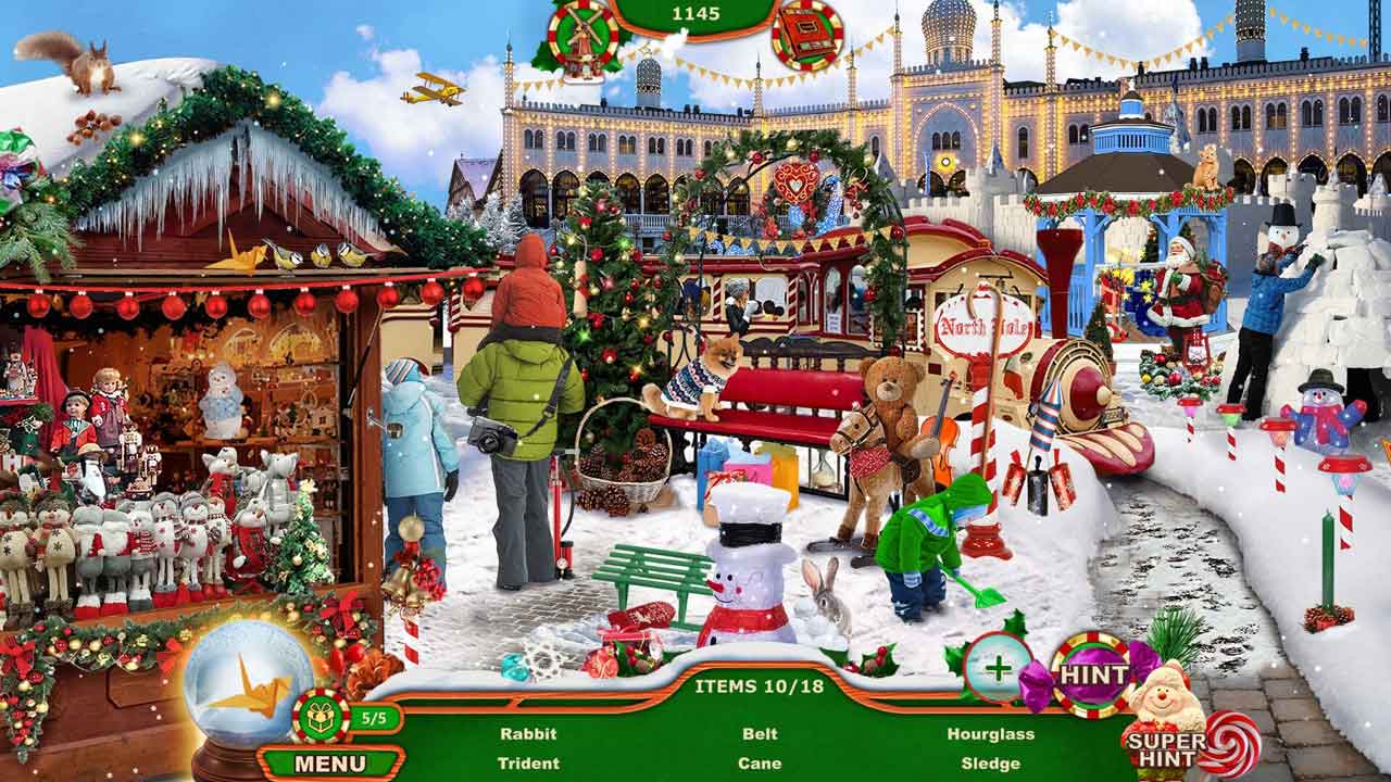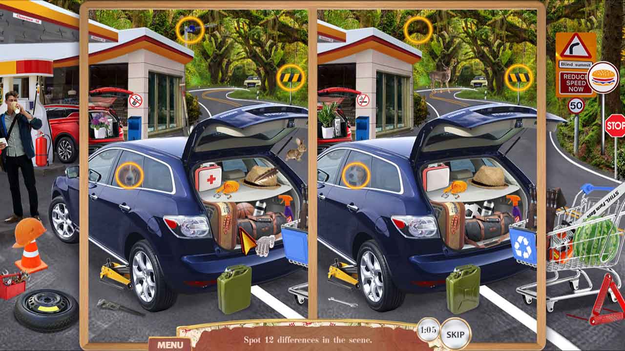 ความท้าทายอีกอย่างคือฉากต่างๆ จะมีสถานที่เล็กๆ ที่ทำเครื่องหมายด้วยดาวสีเหลือง แต่ข้อดีคือเมื่อคุณหาสิ่งของทั้งหมดเจอแล้ว สถานที่เหล่านั้นจะหายไป สำหรับคะแนนพิเศษ คุณสามารถมองหาแรคคูน สิ่งของเพิ่มเติมหลายชิ้นที่แสดงอยู่ในลูกแก้วหิมะ แสตมป์ และของที่ระลึกที่มีอยู่ในแต่ละฉาก บางครั้งฉากอาจเปลี่ยนแปลงไปโดยการแสดงสิ่งของในรูปแบบเงา หรือเพิ่มปริศนาตรรกะสั้นๆ ที่คุณต้องจับคู่บางสิ่งหรือเติมเต็มภาพ มีปุ่มข้ามที่สะดวกหากคุณไม่ต้องการแก้ปริศนาหรือรู้สึกหงุดหงิด
