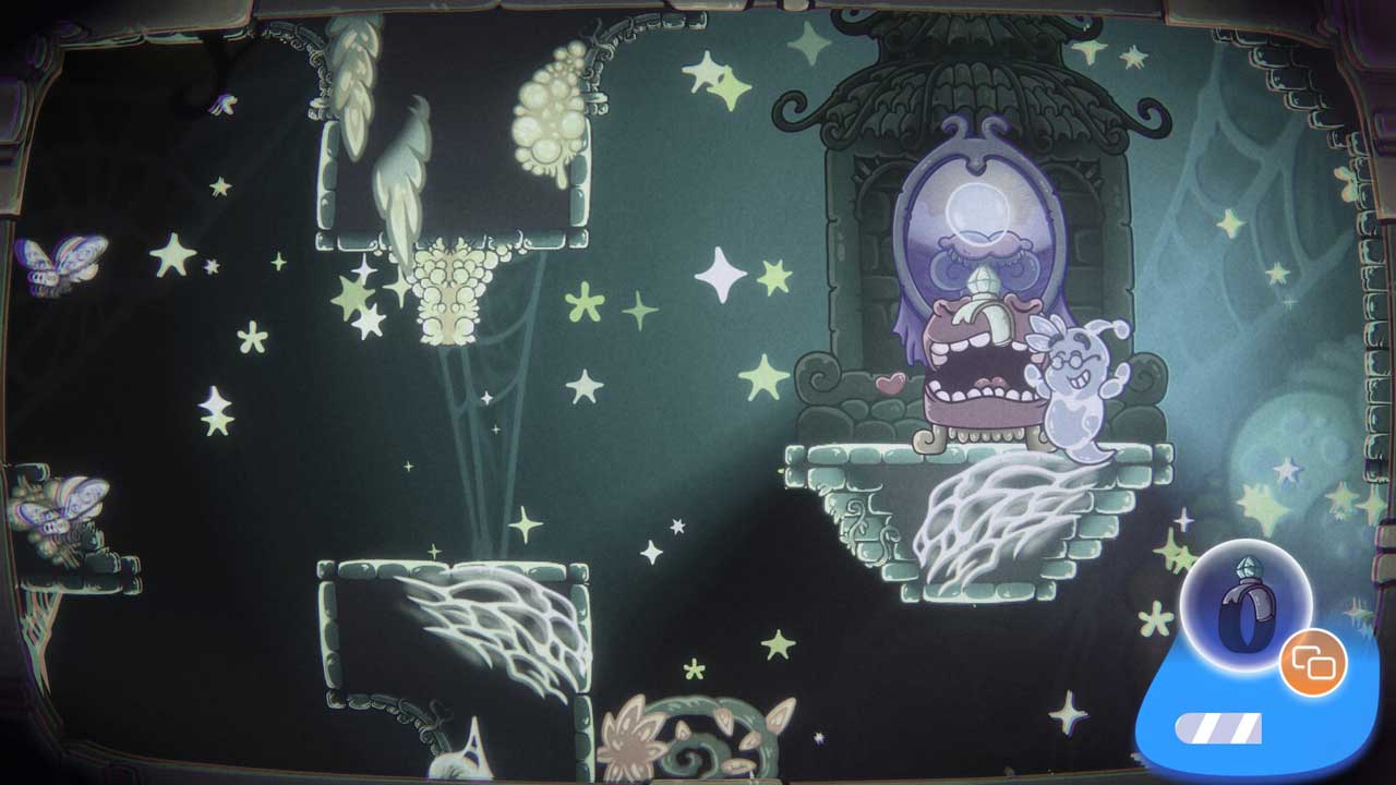 ฉันต้องเน้นย้ำว่าอย่าหลงกลกับรูปลักษณ์ที่เรียบง่ายของ Bubble Ghost Remake เนื่องจากเกมนี้ท้าทายอย่างไม่น่าเชื่อและไม่เหมาะกับทุกคน หากคุณมีความอดทน คุณอาจต้องพบกับทั้งความสนุกสนานและความหงุดหงิดขณะที่คุณนำฟองอากาศน้อยๆ ไปยังที่ปลอดภัย ศัตรูมากมาย เช่น แมงมุม และตัวร้ายทุกประเภท รอคอยคุณอยู่ในแต่ละด่าน เช่นเดียวกับกับดักมากมาย และทุกๆ พิกเซลของพื้นหลังสามารถทำให้ฟองสบู่แตกได้ ดังนั้นต้องระวังให้ดี หากคุณมีความเร็วพอในบางด่าน คุณก็สามารถรวบรวมพอร์ทัลสเปกตรัมได้ แต่คุณจะต้องกินมื้อเย็นให้เร็วเพื่อรับมัน การรวบรวมชุดที่มีชิ้นส่วนเรื่องราวก็สนุกเช่นกัน