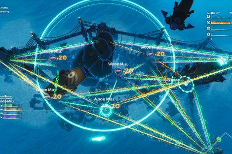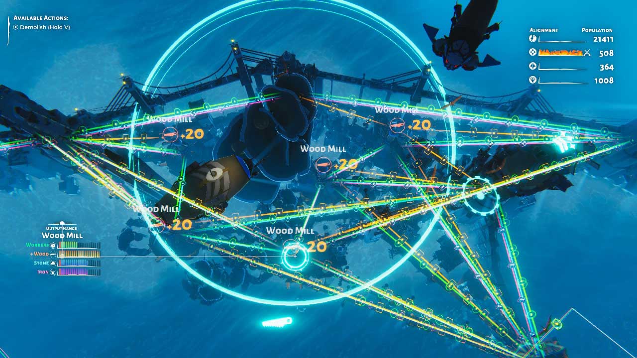 อาคารต่างๆ ถูกสร้างขึ้นภายในไม่กี่วินาที ฐานใหม่ อาคารสกัดทรัพยากร หรือท่าเรือถูกสร้างขึ้นด้วยเรือเหาะของคุณ อาคารอื่นๆ ส่วนใหญ่ในนิคมของคุณจะติดกับอาคารที่มีอยู่ เมื่อคุณคุ้นเคยกับการควบคุมแล้ว พวกมันก็ทำงานได้ค่อนข้างดี โดยพื้นฐานแล้ว “A” ใช้เพื่อย้ายกล้องจากอาคารหนึ่งไปอีกอาคารหนึ่ง “X” ถูกใช้เพื่อสร้างและอัพเกรด “B” ใช้เพื่อทำลายอาคาร ใช้ ‘Y’ เพื่อสลับระหว่างโหมดเรือเหาะและภาคพื้นดิน มีเพียงบอลลูนเท่านั้นที่คุณสามารถสำรวจสภาพแวดล้อมได้อย่างอิสระ คุณยังสามารถสั่งการเรือเหาะบนแผนที่ทั่วไปได้ ซึ่งเป็นวิธีที่ง่ายที่สุดในการเดินทางระยะไกลทางทะเล