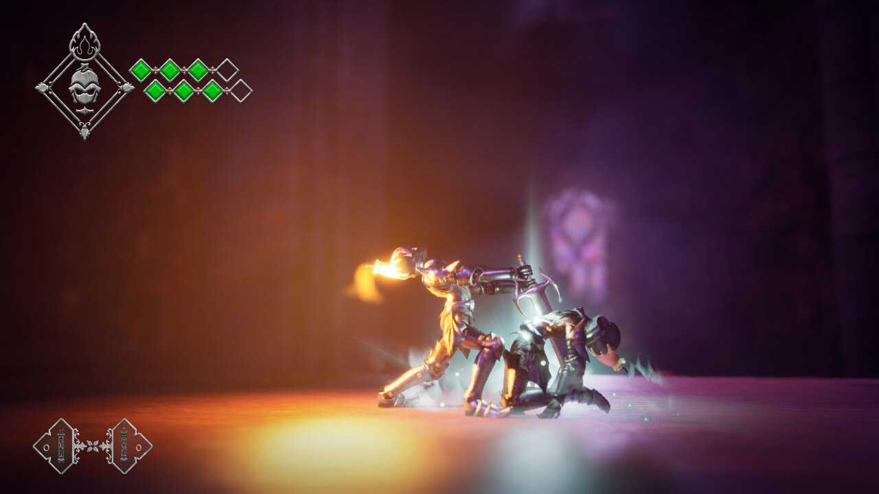 ในรูปแบบการเล่นของ Candle Knight ซึ่งแตกต่างจากเกม 2.5D Metroidvania อื่นๆ ดาบคืออาวุธชิ้นแรกและชิ้นเดียวของคุณ อาวุธนี้ทรงพลังมากและสามารถทำลายศัตรูได้ด้วยการฟันเพียงไม่กี่ครั้ง ศัตรูที่โจมตีจะเติมเกจที่แสดงให้เห็นว่าคุณ “ลุกเป็นไฟ” แค่ไหน แถบจะว่างเปล่าเมื่อคุณไม่โจมตี แนวคิดก็คือต้องเร็วขึ้นและแข็งแกร่งขึ้นเมื่อคุณวอร์มอัพ แต่ค่าใช้จ่ายก็คือการป้องกันของคุณจะได้รับผลกระทบ