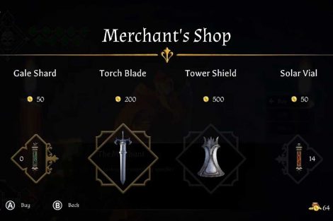 พ่อค้าที่ปรากฏตัวเป็นประจำเมื่อคุณเล่นเกมอาจเสริมทั้งดาบและโล่ของคุณ อุปกรณ์ได้รับการเสริมความแข็งแกร่งในการโจมตีหรือป้องกันและได้รับรูปลักษณ์ใหม่ แม้ว่าคุณสามารถตรวจสอบสินค้าทั้งหมดในสินค้าคงคลังได้ แต่คุณไม่สามารถเลือกสินค้าที่จะสวมใส่ได้ ไม่ว่าจะด้วยวิธีใดก็ตาม ตัวเลือกมีไม่มากนัก มีเพียงห้าการอัพเกรดสำหรับดาบและสามการอัพเกรดสำหรับโล่ คุณสามารถสร้างรายได้จากการฆ่าศัตรูหรือค้นหาหีบสมบัติ เนื่องจากคุณจะไม่สูญเสียอะไรเลยเมื่อคุณตายและศัตรูก็เริ่มต้นขึ้นอีกครั้ง เหรียญทองจึงหาได้ไม่ยาก
