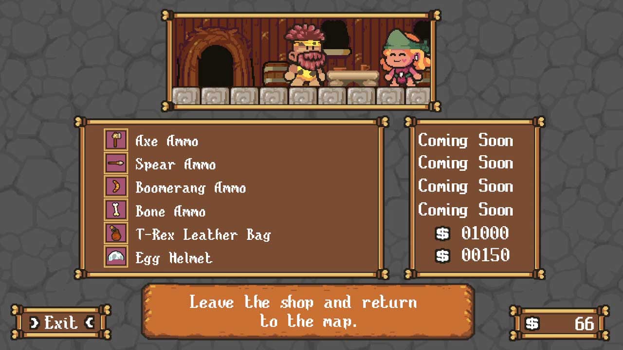 มีอาวุธให้ปลดล็อกหลากหลาย ทั้งขวาน หอก หอก และกระดูก ซึ่งทั้งหมดเป็นอาวุธขว้าง แต่ละครั้งที่คุณฆ่าบอส คุณสามารถปลดล็อคอาวุธเหล่านี้ได้ ที่น่าสนใจคือกระสุนของอาวุธเหล่านี้มีจำกัด และคุณควรใช้ความระมัดระวังด้วย ในแต่ละระดับของเกมจะมีบิลในรูปแบบของไอเท็มสะสมที่คุณสามารถใช้ในร้านค้าเพื่อซื้อการอัพเกรดอาวุธได้ การได้รับไอเทมที่ช่วยให้คุณได้รับกระสุนไม่จำกัดอย่างรวดเร็วถือเป็นวิธีที่ดีในการลดความยาก