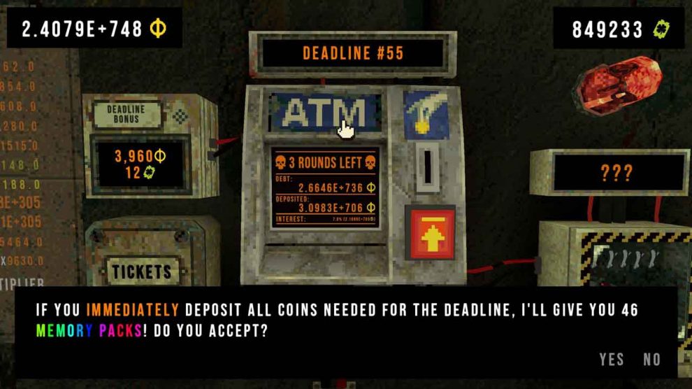 คุณจะเล่นเป็นคนที่ถูกขังอยู่ในห้องขังเก่าๆ ที่มีเครื่องสล็อตและตู้เอทีเอ็ม และคุณต้องจ่ายหนี้ให้หมดเมื่อจบแต่ละรอบ ไม่เช่นนั้นคุณจะถูกทำลาย โดยพื้นฐานแล้ว ผู้พัฒนาได้ขังคุณไว้ในห้องมืดๆ ที่มีเครื่องสล็อต โทรศัพท์ที่ดังพร้อมข่าวร้าย และหลุมใต้เท้าของคุณ หลักการง่ายๆ คือ จ่ายหนี้ให้หมด หรือไม่ก็ “ล้มละลาย”… จริงๆ