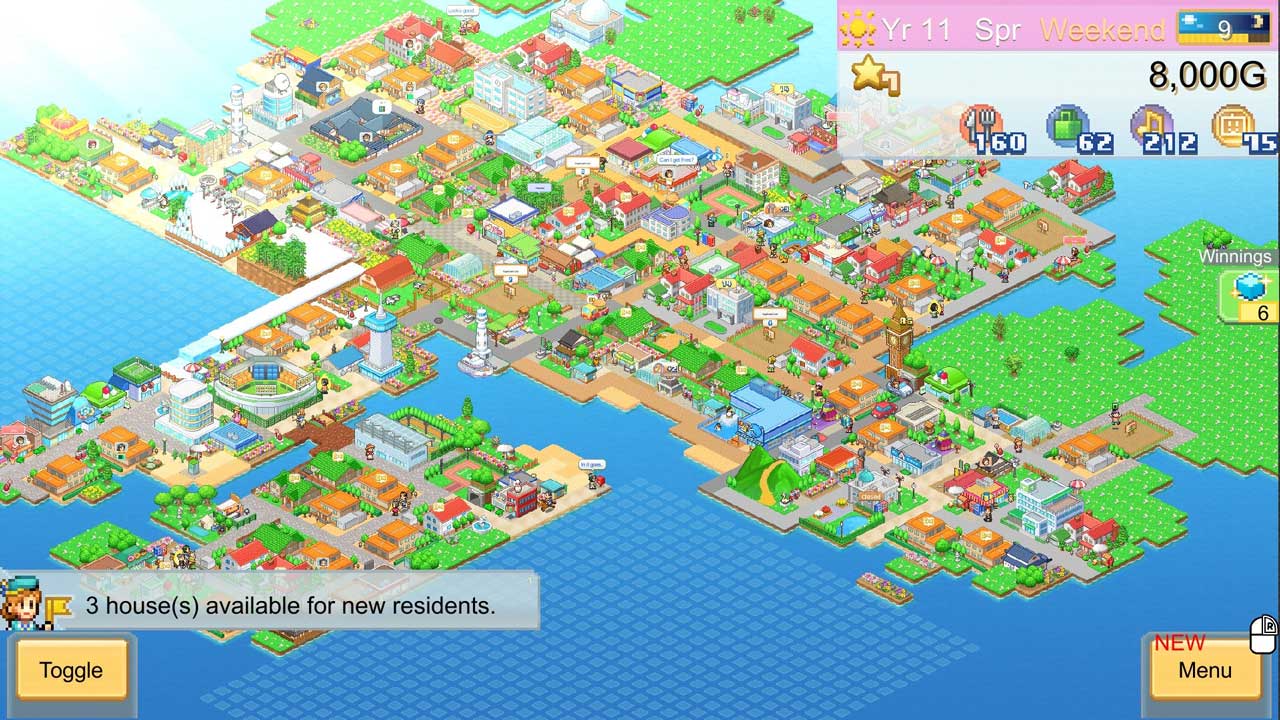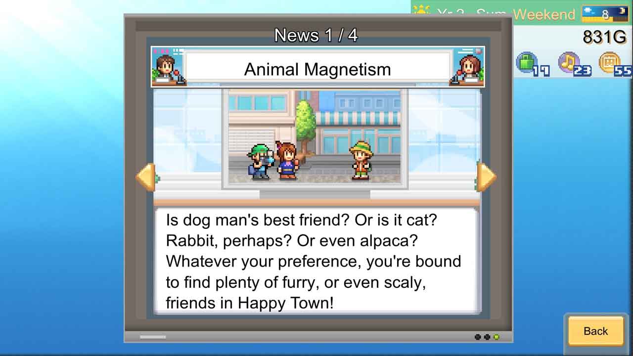 ฉันเล่นเกม Kairosoft สมัยเป็นเด็ก และฉันรู้สึกดีใจมากที่เห็นว่าสูตรของเกมไม่ได้เปลี่ยนแปลงไปเลย แต่แค่ปรับปรุงให้ดีขึ้น! เกมนี้มีเป้าหมายอันดับ 1 เหมือนกันคือการบรรลุเป้าหมาย… เหมือนกับเกมจำลองสถานการณ์อื่นๆ ทั่วไป แต่มีสิ่งที่ต้องทำมากกว่านั้นมาก เช่น การเตรียมชาวเมืองให้พร้อมสำหรับการแต่งงาน หรือทำภารกิจก่อสร้างให้สำเร็จเพื่อให้ชาวเมืองทุกคนไปทำงานกับวัว หรือการจัดระเบียบเขตต่างๆ และตกแต่งเมืองของคุณ โดยพื้นฐานแล้ว มันเป็นเพียงวงจรการเล่นเกมที่แสนง่ายซึ่งมีวิธีการใช้งานที่แตกต่างกัน