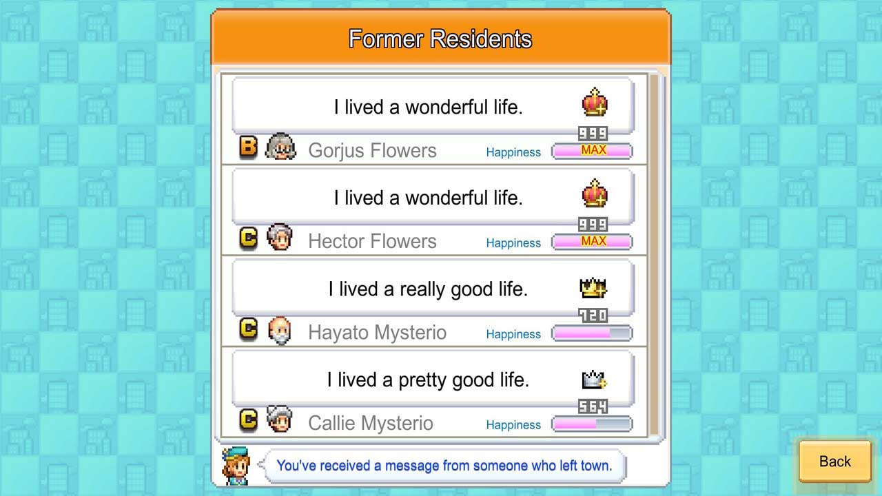 ตามที่คาดไว้ Kairosoft มอบภาพพิกเซลอาร์ตอันสนุกสนานในเกมจำลองไดนามิก บางส่วน โดยเฉพาะฉากที่ไม่ควรพลาดและฉากแข่งรถ/โรแมนติก อาจให้ความรู้สึกซ้ำซาก แต่การจัดการเค้าโครงเมืองมีความลุ่มลึกอย่างน่าประหลาดใจ อาคารต่างๆ จะต้องได้รับการจัดเรียงในรูปแบบปริศนาโบนัสตามละแวกใกล้เคียงพร้อมๆ กับตอบสนองความต้องการของผู้อยู่อาศัยประเภทต่างๆ ด้วย การเลือกอาคารที่แตกต่างกันสามารถทำให้ผู้อยู่อาศัยของคุณมีสถิติที่ดีขึ้น มีงานอดิเรก มีรายได้ หรือผลิตทรัพยากรที่แตกต่างกันออกไป ทำให้เกิดการวางกลยุทธ์ได้