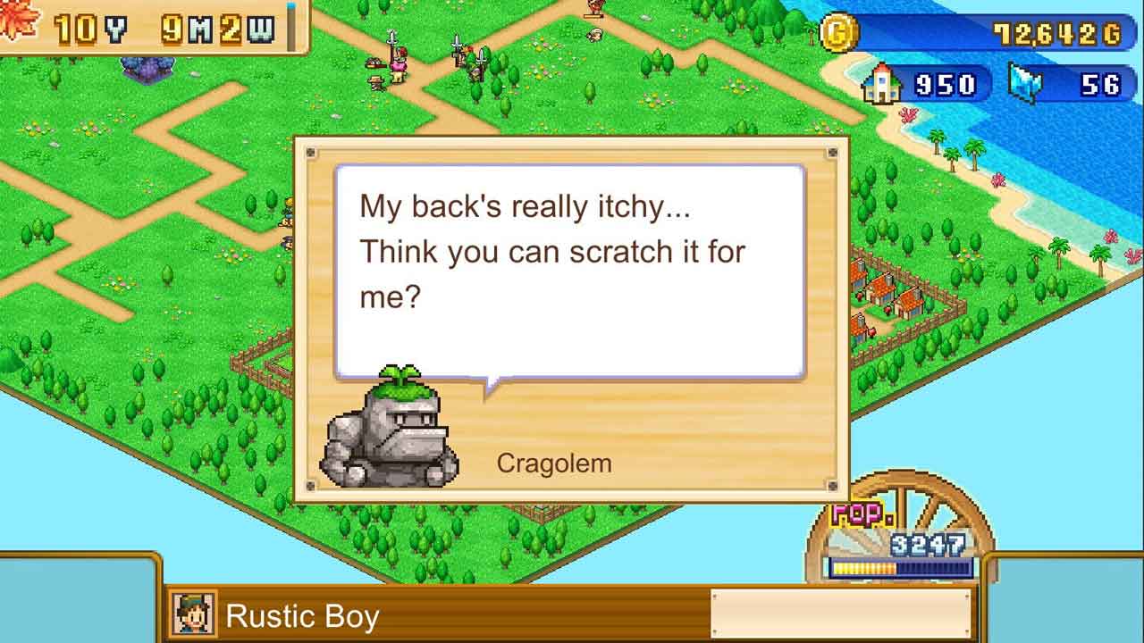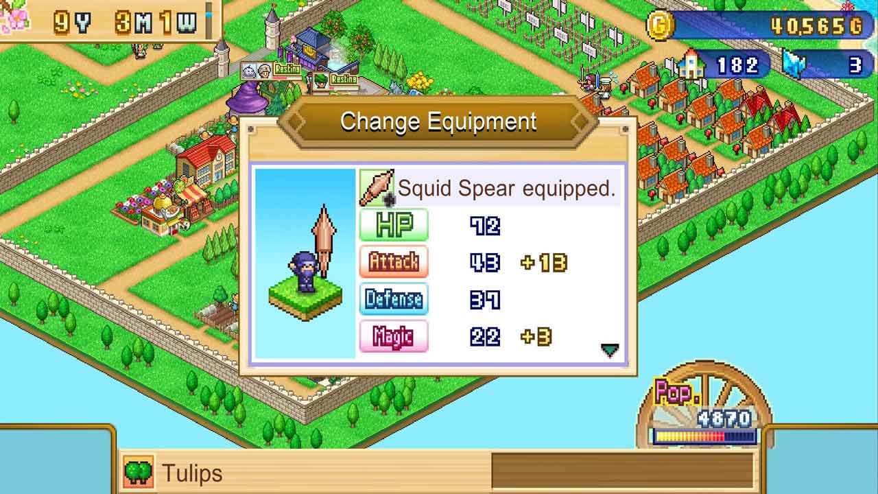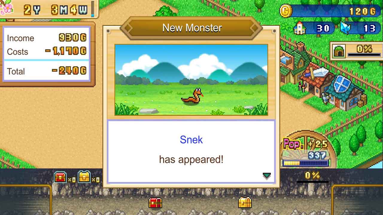 เมืองของคุณยังมีบทบาทสำคัญในการก้าวหน้าในเกมของคุณด้วย มันไม่เพียงแต่จะนำทองมาให้คุณเท่านั้น แต่หากคุณสร้างสิ่งอำนวยความสะดวกที่ถูกต้อง ความนิยมของคุณก็จะเพิ่มขึ้นอีกด้วย ได้รับความนิยมเพียงพอ (รวมถึงสิ่งอื่นๆ) และรับดาวหนึ่งดวง ถึงห้าดาวแล้วไปต่อที่เมืองถัดไป ปัญหาใหญ่ของเกม Dungeon Village 2 ก็คืออินเทอร์เฟซมือถือไม่สามารถใช้งานได้บนพีซีและ Xbox ไม่ใช่แบบว่า “ไม่มีอะไรเกิดขึ้น!” แต่ในรูปแบบ “ทำไมทุกอย่างมันใหญ่โตจัง?” เช่นเดียวกับเกม Kairosoft ทุกเกม เกมนี้สร้างขึ้นมาสำหรับมือถือ/จอสัมผัสโดยเฉพาะ แต่เมื่อมีการวางจำหน่ายบน Steam ก็สามารถสันนิษฐานได้ว่าเกมจะมีระบบควบคุมด้วยเมาส์ที่ยังไม่ซับซ้อนมากนัก มันมีอยู่จริง แต่ว่าอย่างดีที่สุดมันก็อ่อนแอ และน่ารำคาญอย่างแย่ที่สุด รายการในเมนูนั้นมีจำนวนมาก และบางครั้ง… หรือส่วนใหญ่… การ “คลิก” บนบางสิ่งบางอย่างขึ้นอยู่กับโชค