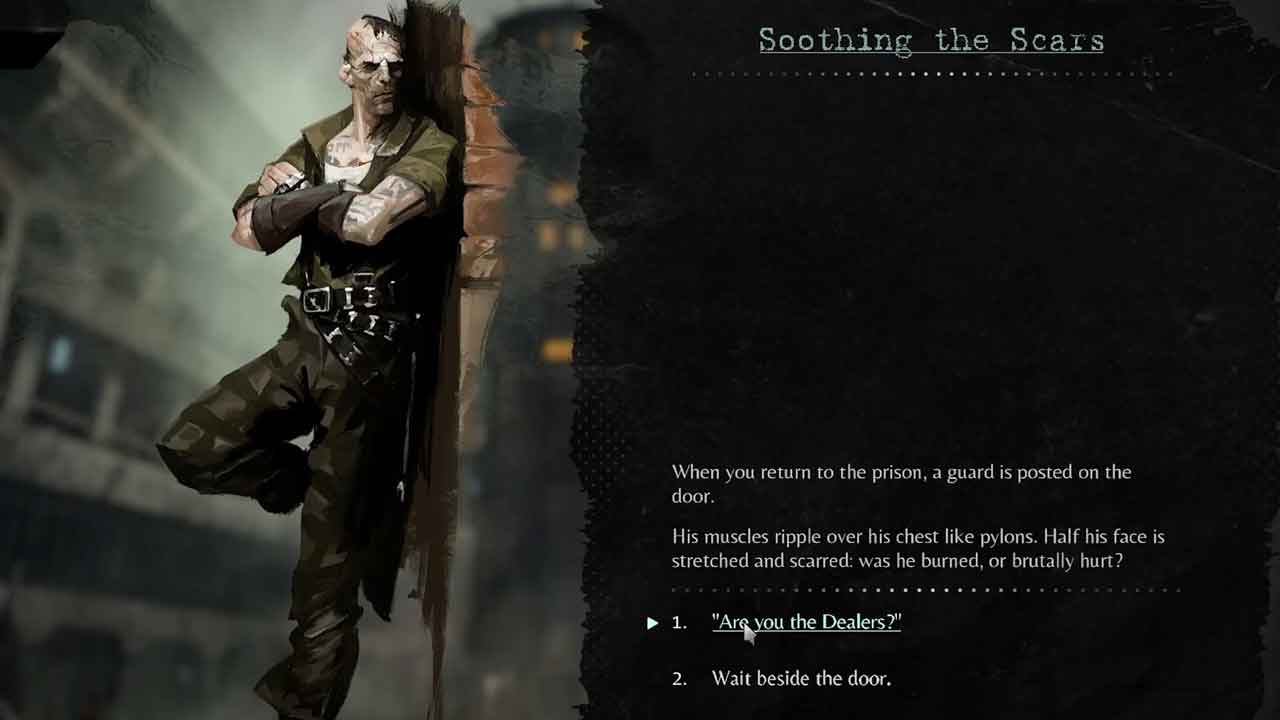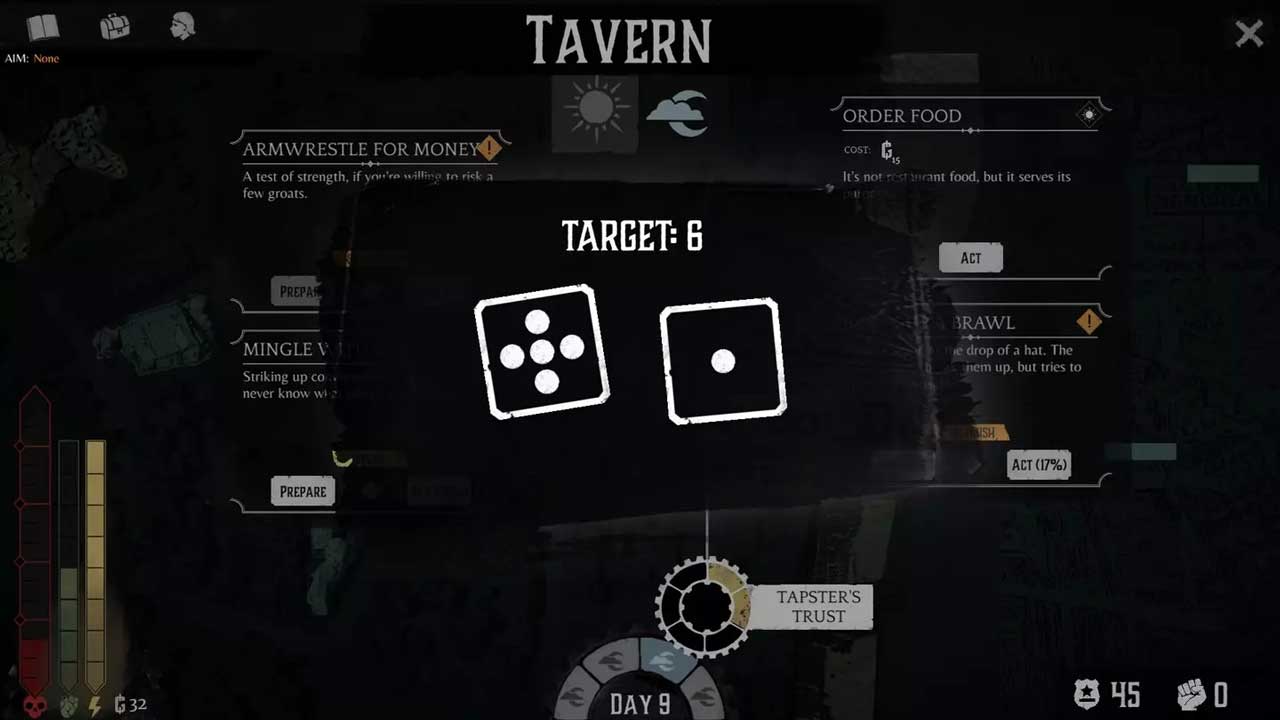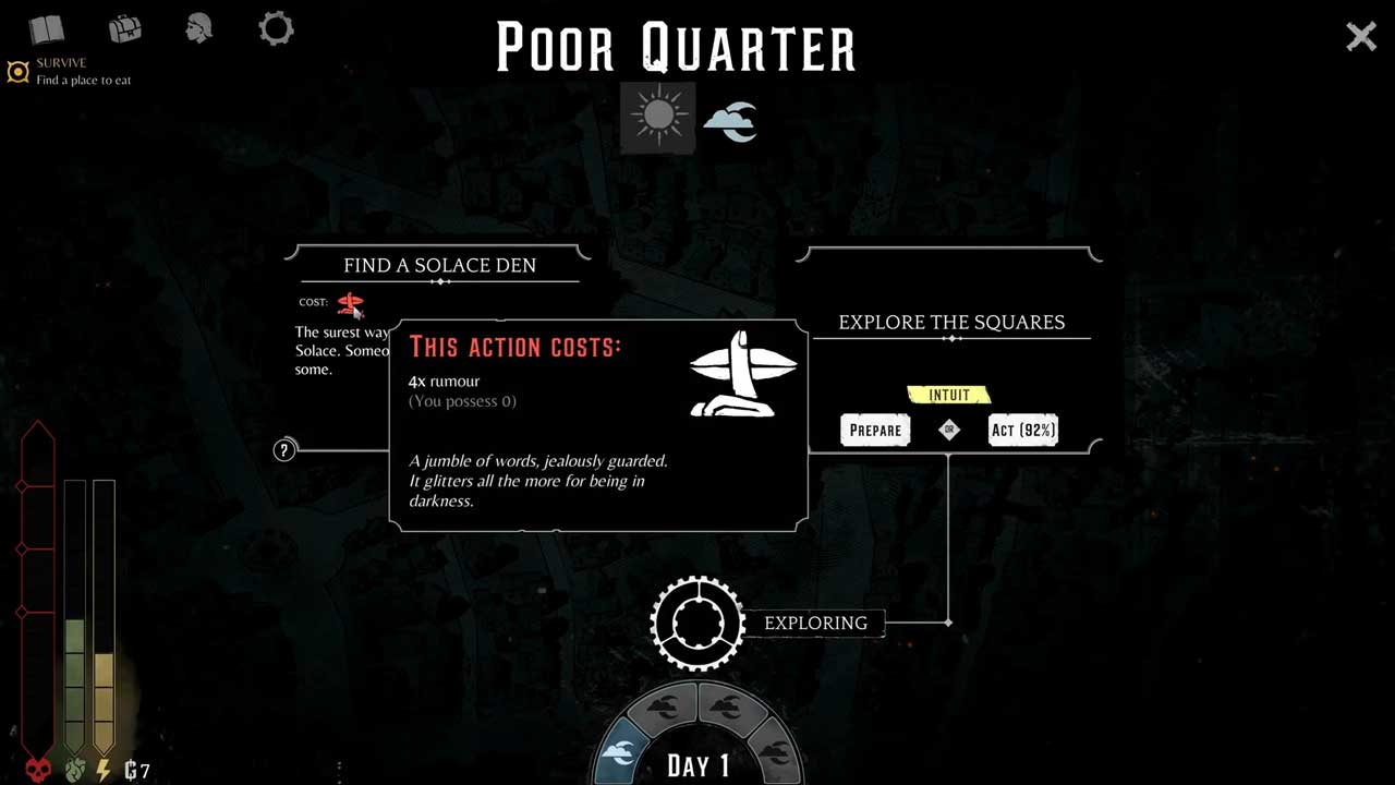ในช่วงต้นเกมจะมีอุปสรรคค่อนข้างยากที่จะหาเงิน (บางอย่างดูเหมือนจะให้ผลตอบแทนมากกว่าอย่างอื่น) แต่โดยทั่วไปแล้วจะขึ้นอยู่กับคลาส/ภูมิหลังเริ่มต้นของคุณ สิ่งที่ฉันเรียนรู้ในช่วงต้นของการเล่นครั้งแรกคือ การรับมือกับความเครียดจากการทอย (หรือผลัก) ลูกเต๋าจะส่งผลเสียต่อค่าสถานะของคุณอย่างหลีกเลี่ยงไม่ได้ แต่คุณสามารถหาเวลาพักฟื้นได้ ดังนั้นคุณจึงไม่ได้โชคร้ายอย่างที่คิด ในช่วงต้นของการเล่นครั้งแรก ฉันรู้สึกเหมือนทุกอย่างกำลังแย่ลงจนกระทั่งฉันพบสถานที่ที่สามารถรักษาความเครียดที่สะสมได้ มันค่อนข้างน่าหงุดหงิด แต่ฉันก็ผิดเองที่พลาดสถานที่ที่สามารถใช้เวลาคลายความเครียด (และฟื้นฟูพลังงานโดยไม่ต้องเสียเงินซื้ออาหาร)