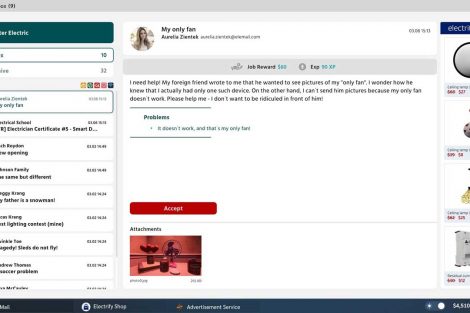 อย่างที่บอกไปแล้ว โดยทั่วไปการเล่นเกมจะแบ่งออกเป็นสองประเภท หมวดแรกคือการตรวจสอบและซ่อมแซมเครื่องใช้ไฟฟ้าที่บ้าน และอีกประเภทคือการตรวจสอบและเดินสายไฟปลั๊กและวงจรกำหนดเส้นทาง ซึ่งกินเวลาส่วนใหญ่ของคุณ อย่างแรกนั้นอธิบายได้ในตัว แต่อย่างที่สองคุณต้องไปที่เดสก์ท็อป ซึ่งฉันคิดว่าเป็นส่วนที่น่าตื่นเต้นที่สุดของการเล่นเกม เราต้องยอมรับงานที่เกี่ยวข้องจากคอมพิวเตอร์ของเราและเข้าสู่อินเทอร์เฟซเดสก์ท็อปเพื่อตรวจสอบว่าอุปกรณ์ต่างๆ ได้รับความเสียหายหรือไม่ ทุกสิ่งที่เราทำในขั้นตอนนี้สื่อถึงความรู้สึกที่แท้จริงของช่างไฟฟ้า