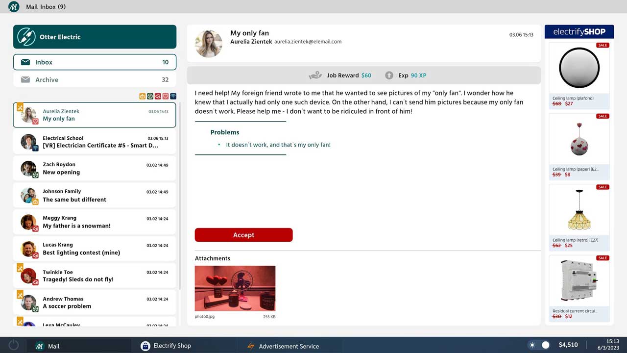 ในเกมนี้ เราคือช่างไฟฟ้าในอนาคตที่ค่อยๆ เรียนรู้เคล็ดลับทั้งหมดของการค้าขายหลังจากรับช่วงต่อธุรกิจของครอบครัวจากพ่อที่เกษียณแล้ว เริ่มต้นด้วยงานง่ายๆ เช่น การเปลี่ยนปลั๊กไฟ คุณจะค่อยๆ มีทักษะเพิ่มขึ้นจนกลายเป็นช่างไฟฟ้าที่ประสบความสำเร็จอย่างแท้จริง เรื่องราวจะเสร็จสมบูรณ์ในตอนท้ายของเกม แต่เนื้อหาที่รวมอยู่ในนั้นไม่ใช่เกมจำลองสถานการณ์ธรรมดา ๆ กล่าวอีกนัยหนึ่งเรื่องราวของมันไม่ซับซ้อนหรือมีการแข่งขันมากเกินไป มันเรียบง่ายและอย่างที่ควรจะเป็น และฉันก็คาดหวังสิ่งนี้จากเกมนี้ เพราะมันเป็นเกมจำลองสถานการณ์ ฉันคิดว่าตอนจบจบลงด้วยดี แต่รู้สึกเหมือนได้รับสัญญาณสำหรับเกมที่สอง