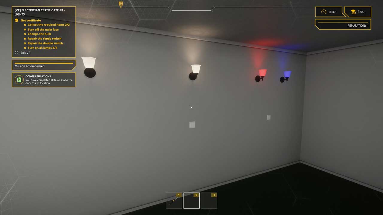 รูปแบบเกมของ Electrician Simulator นั้นผ่อนคลายและคุ้มค่ามาก ๆ และมันก็ทำให้คุณมีงานที่หลากหลาย คุณมีหน้าที่งานไฟฟ้าตามปกติ: ตั้งแต่พื้นฐาน เช่น สวิตช์/ซ็อกเก็ตและสายจัมเปอร์ ไปจนถึงงานที่ซับซ้อนมากขึ้น เช่น กล่องฟิวส์สายไฟ และการตั้งค่าเครือข่ายอุปกรณ์อัจฉริยะ ซึ่งประกอบขึ้นเป็นการเล่นเกมหลัก จากนั้น มีงานเสริมที่โต๊ะของคุณ ซึ่งรวมถึงการตรวจสอบและซ่อมแซมอุปกรณ์อิเล็กทรอนิกส์ต่างๆ สำหรับคน และสามารถทำได้แบบติดต่อกันและทำได้ง่ายๆ ในโรงรถของคุณ เป็นวิธีที่ดีในการทำลายความซ้ำซากจำเจของการเล่นเกม