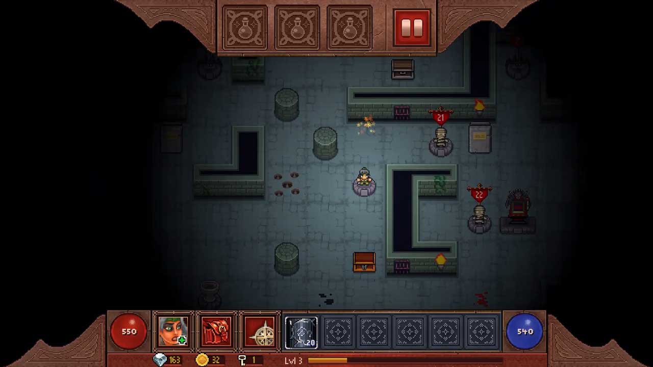 รูปแบบการเล่นอาจกล่าวได้ว่าคล้ายกับเกมกระดาน คุณต้องย้ายฮีโร่ที่คุณเลือกไปรอบๆ เขาวงกตเหล่านี้และกำจัดสัตว์ประหลาดที่ซุ่มซ่อนอยู่ในเงามืด กล้องของเกมนี้มองจากบนลงล่าง และด้วยเหตุนี้ คุณจึงสามารถควบคุมและมองเห็นโลกของเกมได้เพียงพอ ในเกมมีโซนทั้งหมด 6 โซน แต่ละโซนมีชีวนิเวศเฉพาะของตัวเอง ซึ่งในตอนแรกคุณสามารถเข้าถึงได้ 3 โซน: Dark Forest, Damned Rocks และ Grim Castle คุณสามารถหาคริสตัลได้ในระหว่างการผจญภัย ไอเท็มเหล่านี้มีบทบาทสำคัญในการพัฒนาเกม ดังนั้นด้วยคริสตัลเหล่านี้ คุณสามารถซื้ออุปกรณ์และคะแนนจากหมู่บ้านได้ นอกจากนี้ หากเลเวลของคุณเท่ากับหรือสูงกว่า 5 คริสตัลบางส่วนจะมอบให้คุณหลังจากตายด้วย ครั้งแรกที่คุณตาย คุณจะได้รับ 30 คริสตัล แต่ครั้งต่อไปที่คุณตาย คุณจะต้องรวบรวมด้วยตัวเองจากทั่วโลกของเกม