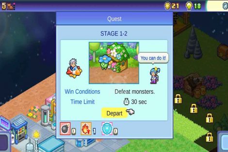 ทำไมผมถึงเรียกเกมนี้ว่าเกมเล่นอัตโนมัติ (idle game)? เพราะหากคุณไม่สามารถผ่านด่านได้ คุณสามารถปล่อยให้เกมทำงานไปเรื่อยๆ เพื่อรวบรวมวัสดุที่จำเป็น เพิ่มเลเวล และจากนั้นคุณก็สามารถผ่านด่านได้ อย่างไรก็ตาม ผมแนะนำให้ลองอีกสักสองสามครั้ง แม้ว่าคุณจะเอาชนะไม่ได้ก็ตาม เพราะมีป้ายบอกว่าต้องล้มเหลวหลายครั้งถึงจะผ่านได้