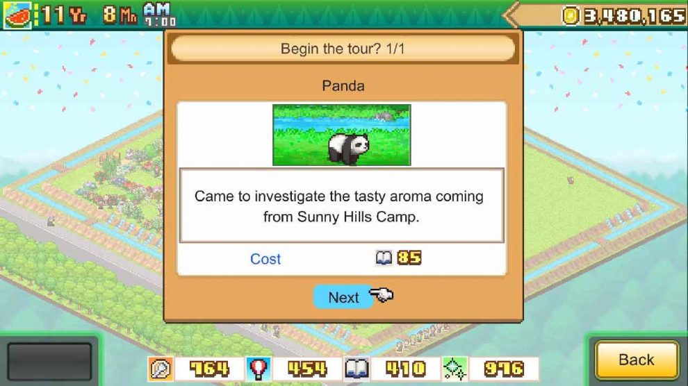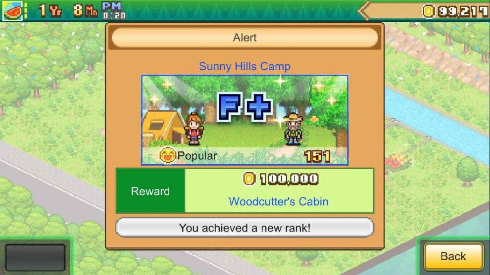 เช่นเดียวกับเกม Kairosoft อื่นๆ คุณจะได้รับคะแนนสำหรับสวนสาธารณะของคุณที่นี่เช่นกัน คุณจะจัดการงบประมาณของคุณและค้นคว้าไอเท็มใหม่สำหรับทั้งร้านค้าและแคมป์ จังหวะเริ่มต้นของเกมค่อนข้างช้าและไม่มีอะไรให้ทำมากนัก ดังนั้นเพื่อที่จะหาเงินจากร้านอุปกรณ์ตั้งแคมป์ คุณต้องไปที่ร้านแล้วคลิกที่หน้าต่างด้านขวาล่างของหน้าจอ บ่อยแค่ไหนที่จะใส่เงินเข้าสินค้าคงคลังของคุณซึ่งค่อนข้างยุ่งยากเล็กน้อย