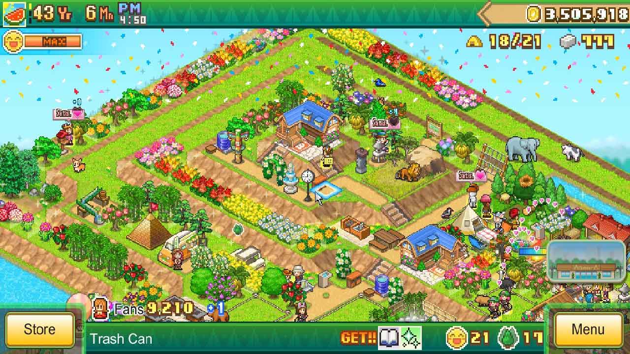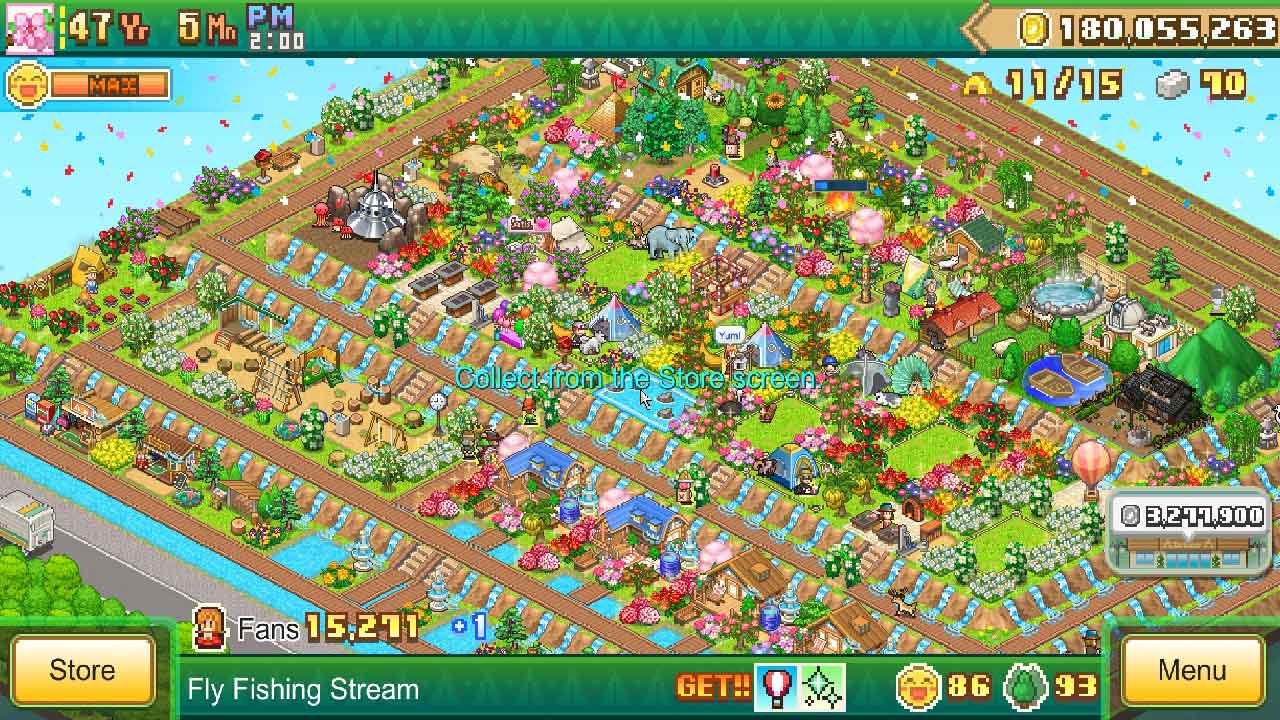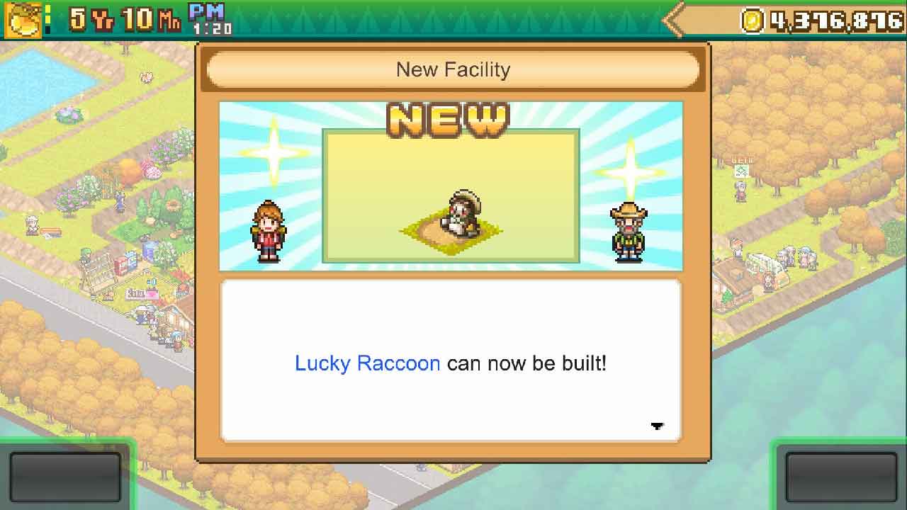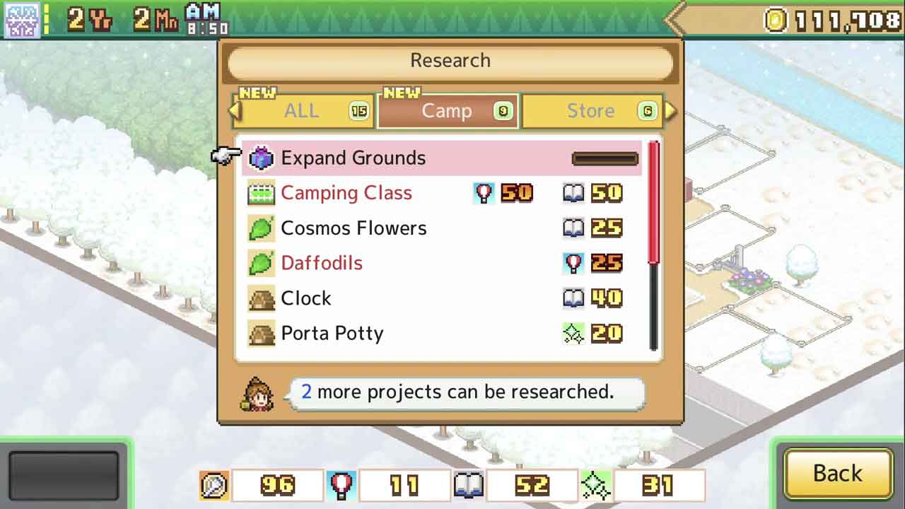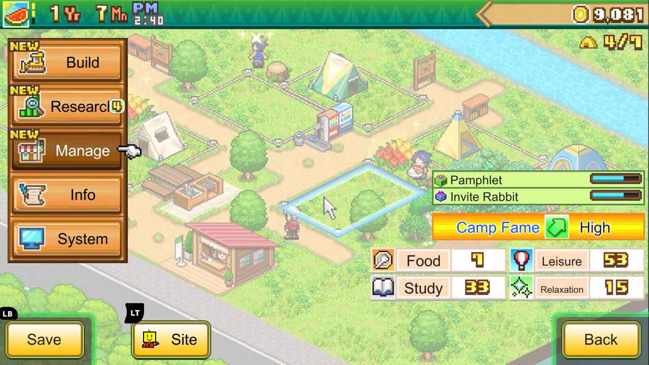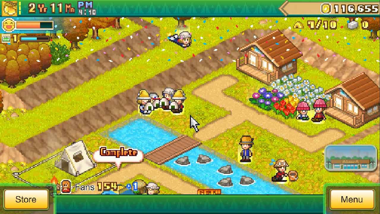 เช่นเดียวกับเกม Kairosoft อื่นๆ คุณจะได้รับคะแนนสำหรับสวนสาธารณะของคุณที่นี่เช่นกัน คุณจะจัดการงบประมาณของคุณและค้นคว้าไอเท็มใหม่สำหรับทั้งร้านค้าและแคมป์ จังหวะเริ่มต้นของเกมค่อนข้างช้าและไม่มีอะไรให้ทำมากนัก ดังนั้นเพื่อที่จะหาเงินจากร้านอุปกรณ์ตั้งแคมป์ คุณต้องไปที่ร้านแล้วคลิกที่หน้าต่างด้านขวาล่างของหน้าจอ บ่อยแค่ไหนที่จะใส่เงินเข้าสินค้าคงคลังของคุณซึ่งค่อนข้างยุ่งยากเล็กน้อย