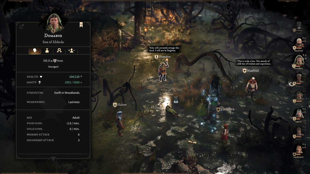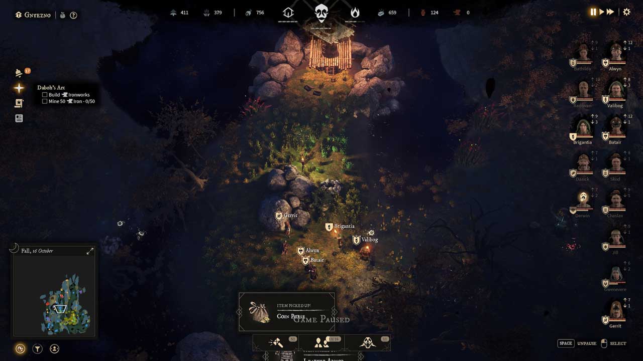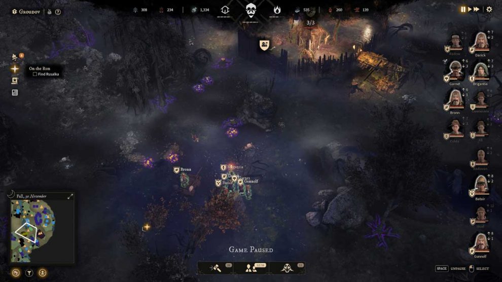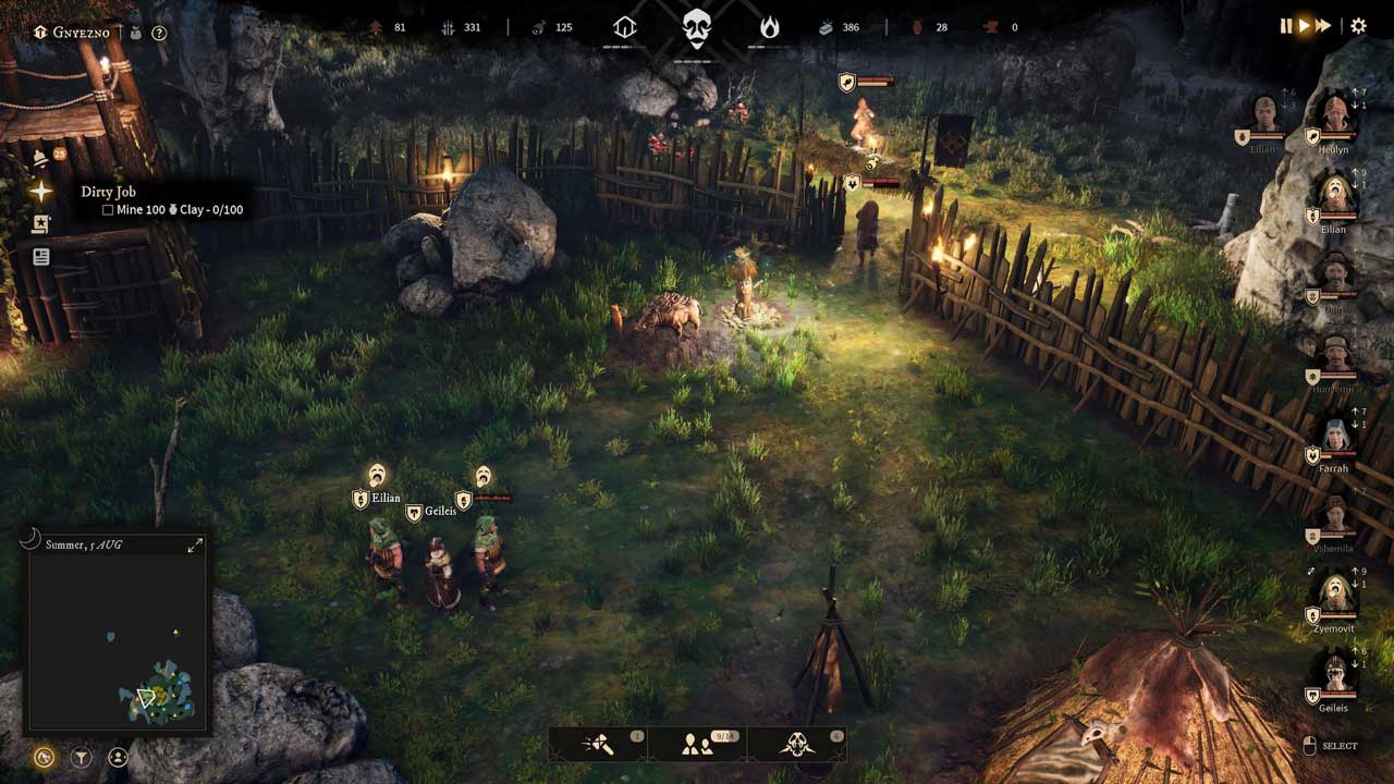 เมื่อฉันพูดว่า “เรียบง่าย” ฉันหมายความว่าเกมขาดคุณสมบัติการจัดการที่ซับซ้อนกว่าที่คุณคาดหวังในเกมประเภทนี้ ใน Gord อาณานิคมของคุณจะมีสมาชิกไม่เกิน 15 คน ด้วยเหตุนี้ ฉันจึงถือว่านักพัฒนาคิดว่าพวกเขาไม่จำเป็นต้องใช้เมนูคำสั่งงานเช่น Rimworld การจัดการทั้งหมดทำได้ผ่านการจัดการแบบจุลภาค คุณเองต้องคลิกที่สมาชิกของอาณานิคมและสั่งให้พวกเขารวบรวมโหนดทรัพยากรประเภทใดก็ได้ เมื่อเสร็จแล้ว สมาชิกนั้นจะออกไปเองเพื่อรวบรวมเพิ่มในพื้นที่ที่ไม่เปิดเผย ซึ่งอาจเป็นอันตรายต่อพวกเขา