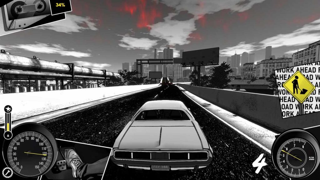 ทันทีหลังจากเริ่มเกม เรามีโอกาสควบคุมยานพาหนะและเร่งความเร็วให้ถึงความเร็วที่ฝ่าฝืนกฎจราจรอย่างชัดเจน แผนที่เมืองสีดำและสีขาวนั้นดูเบาบาง โดยมีแสงไฟของรถคันอื่นๆ และป้ายจราจรที่ไฮไลต์เป็นสีแดงและสีเหลือง เพลงประกอบแบบต่างๆ จะเล่นจากลำโพง หน้าจอจะแสดงมาตรวัดความเร็ว ภาพเคลื่อนไหวการเปลี่ยนเกียร์ และเทปคาสเซ็ตที่แสดงเปอร์เซ็นต์ความคืบหน้าของการไล่ล่า การแข่งขัน หรือฟรีไรด์ จะเห็นได้อย่างชัดเจนว่าการขับรถจากขอบถนนไปด้านข้างจะเพิ่มความกลัว