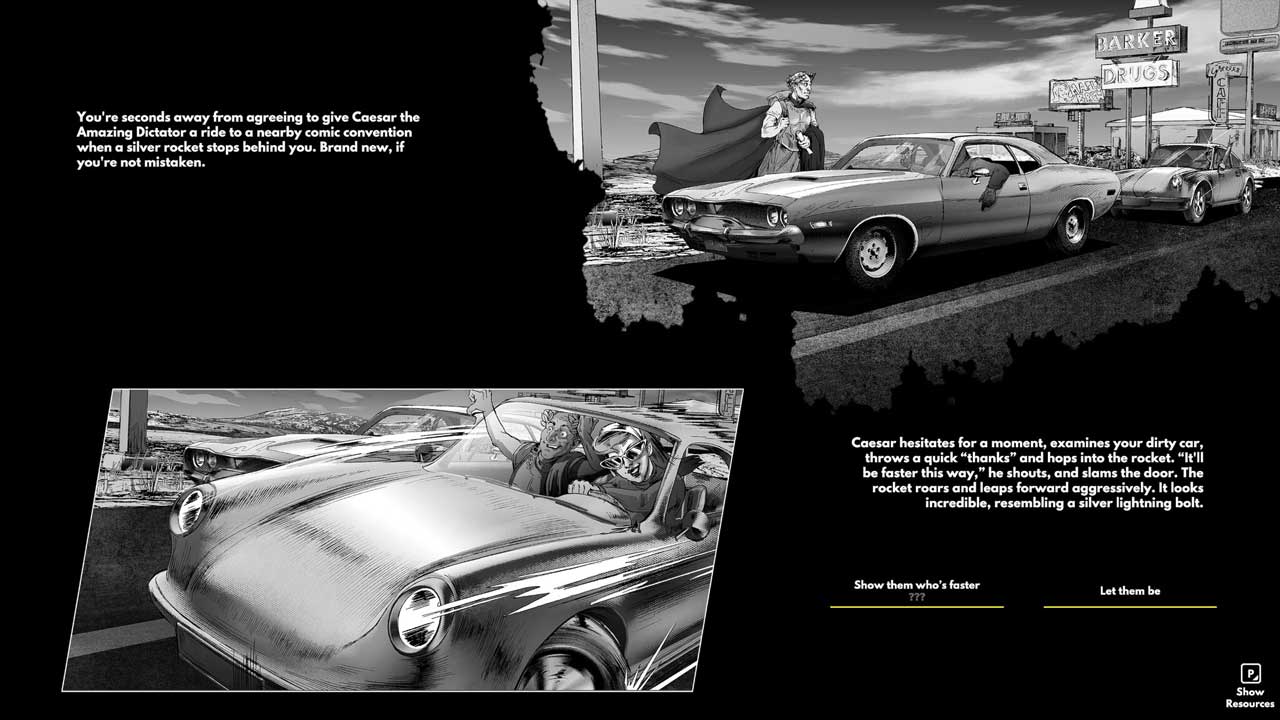 ระหว่างทาง เขาได้พบกับผู้คนและเหตุการณ์มากมาย รถมัสเซิลคาร์สัญชาติอเมริกันสุดเร้าใจของเขาแล่นผ่านรัฐต่างๆ ดึงดูดความสนใจของนักแข่งคนอื่นๆ และตำรวจท้องที่อยู่เสมอ เมื่อตัวเอกดำเนินเรื่องไปเรื่อยๆ ทุกการตัดสินใจของเขาจะส่งผลต่อมุมมองที่คนอื่นมองเขา ไม่ว่าจะเป็นคาวบอยผู้เคารพกฎหมายผู้กล้าหาญ? หรืออาชญากรผู้หลบหนีความยุติธรรม? ชื่อเสียงของตัวเอกจะถูกวัดและแสดงบนหน้าจอ ทำให้สามารถติดตามได้แบบเรียลไทม์ เกมยังมีคำใบ้ที่ช่วยให้คุณคาดการณ์ผลลัพธ์ต่างๆ ของการตัดสินใจของคุณได้ตลอดเหตุการณ์ต่างๆ