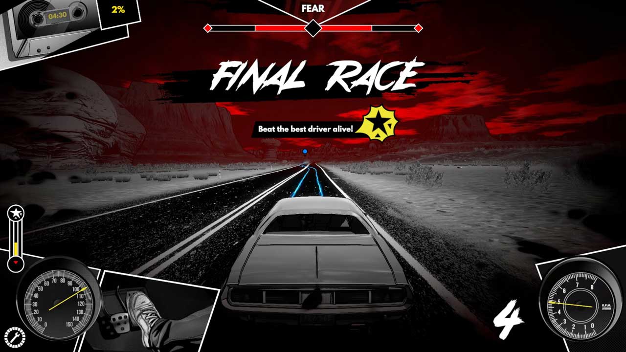 ทันทีหลังจากเริ่มเกม เรามีโอกาสควบคุมยานพาหนะและเร่งความเร็วให้ถึงความเร็วที่ฝ่าฝืนกฎจราจรอย่างชัดเจน แผนที่เมืองสีดำและสีขาวนั้นดูเบาบาง โดยมีแสงไฟของรถคันอื่นๆ และป้ายจราจรที่ไฮไลต์เป็นสีแดงและสีเหลือง เพลงประกอบแบบต่างๆ จะเล่นจากลำโพง หน้าจอจะแสดงมาตรวัดความเร็ว ภาพเคลื่อนไหวการเปลี่ยนเกียร์ และเทปคาสเซ็ตที่แสดงเปอร์เซ็นต์ความคืบหน้าของการไล่ล่า การแข่งขัน หรือฟรีไรด์ จะเห็นได้อย่างชัดเจนว่าการขับรถจากขอบถนนไปด้านข้างจะเพิ่มความกลัว
