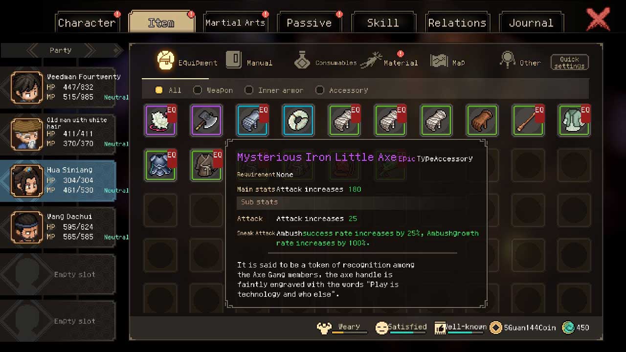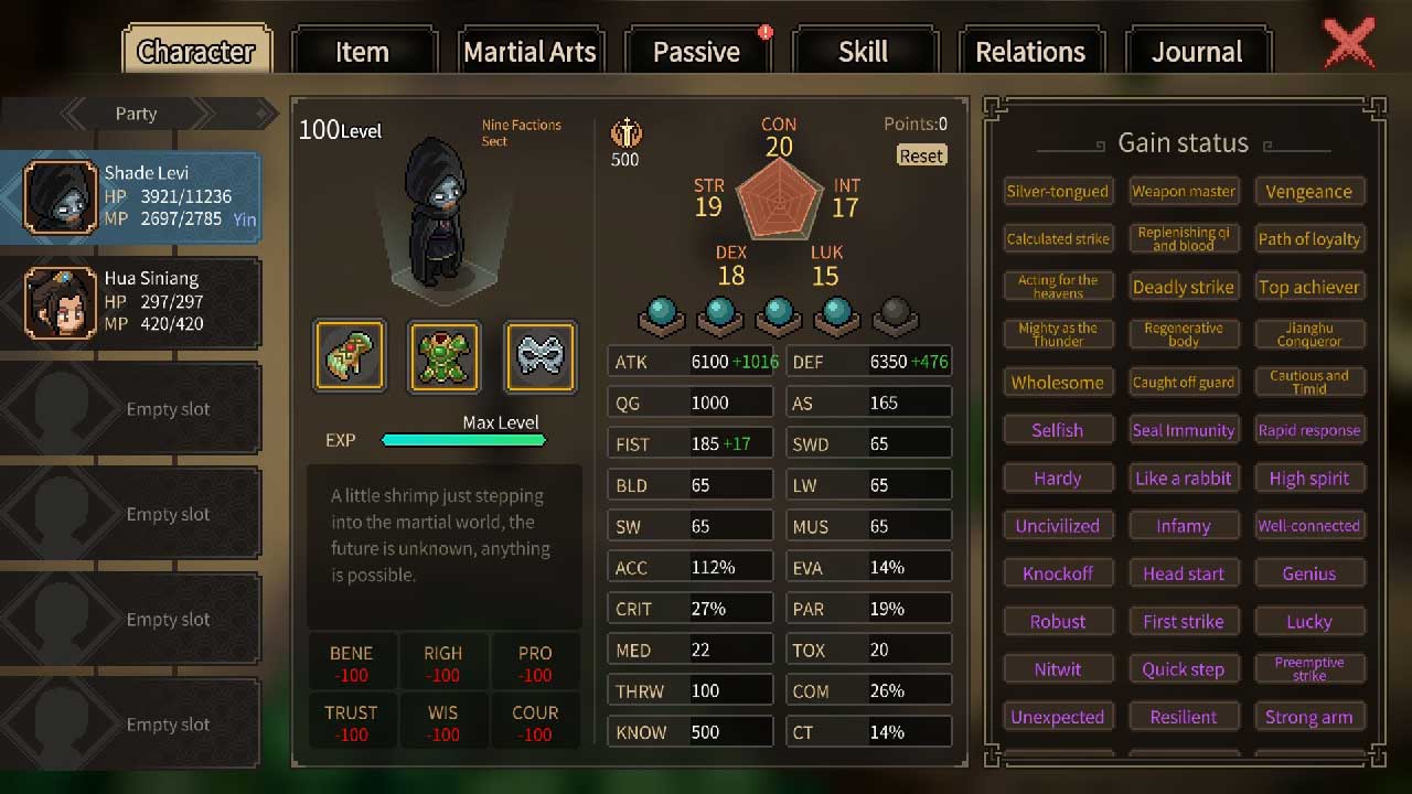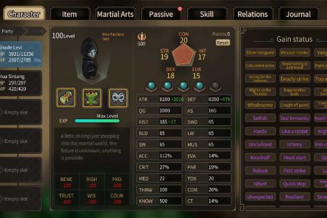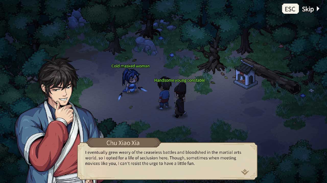 ในเกมธีม Wuxia ที่มีเสน่ห์และสะดวกสบายนี้ คุณจะสวมบทบาทเป็นฮีโร่ตัวเล็ก ๆ ที่มีทักษะศิลปะการต่อสู้ขั้นพื้นฐาน และพยายามทำให้ตำแหน่งของคุณอยู่ในโลกที่เต็มไปด้วยโอกาส ไม่ว่าคุณจะอยากเป็นฮีโร่ ผู้ร้าย หรืออะไรที่แตกต่างไปจากเดิมอย่างสิ้นเชิง เกมนี้เสนอเส้นทางมากมายให้สำรวจ