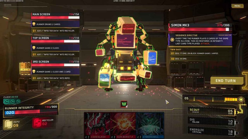 ฉันข้ามบทแนะนำไปเพราะฉันคุ้นเคยกับเกมสร้างเด็คอยู่แล้ว แต่เพียงแค่เอาเมาส์ไปชี้ที่ไอคอน/ดูที่ UI เกมก็จะอธิบายกลไกของมันให้คุณเข้าใจได้ง่าย เวอร์ชันปัจจุบันเริ่มต้นด้วยแฮ็กเกอร์หนึ่งในสองคน แล้วไต่ระดับความยากสี่ระดับเพื่อเอาชนะบอสตัวสุดท้าย ฉันขอแนะนำให้เล่น Ursa ในการเล่นครั้งแรกของคุณ ทักษะของเขาช่วยให้คุณรับมือกับสถานการณ์ได้ง่าย สามารถผ่านไปได้ เพิ่มความแข็งแกร่ง หรือใช้อาวุธปืนได้ ส่วนตัวแล้ว ฉันสนุกมากกับการสร้างเด็คแบบดุดันและแข็งแกร่งกับเขา