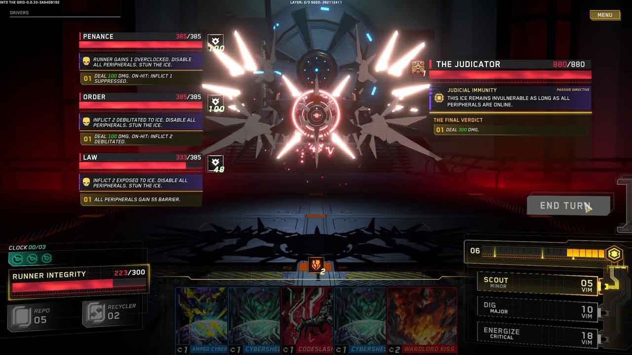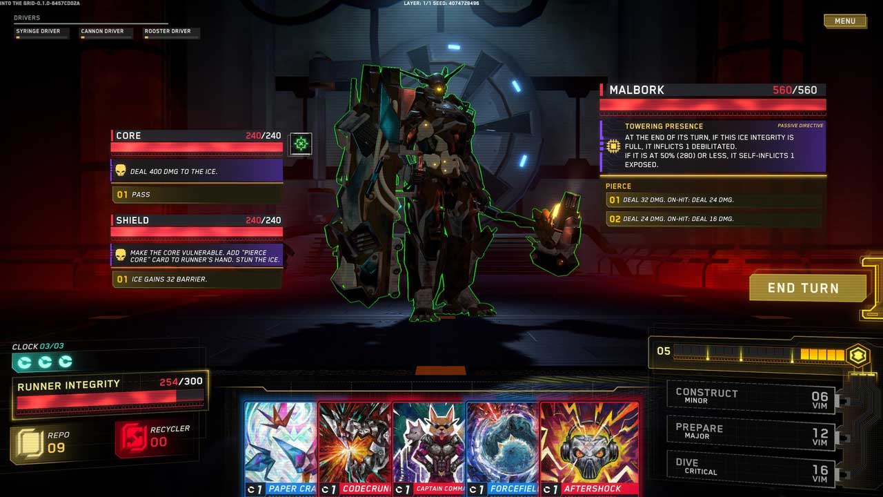 ฉันข้ามบทแนะนำไปเพราะฉันคุ้นเคยกับเกมสร้างเด็คอยู่แล้ว แต่เพียงแค่เอาเมาส์ไปชี้ที่ไอคอน/ดูที่ UI เกมก็จะอธิบายกลไกของมันให้คุณเข้าใจได้ง่าย เวอร์ชันปัจจุบันเริ่มต้นด้วยแฮ็กเกอร์หนึ่งในสองคน แล้วไต่ระดับความยากสี่ระดับเพื่อเอาชนะบอสตัวสุดท้าย ฉันขอแนะนำให้เล่น Ursa ในการเล่นครั้งแรกของคุณ ทักษะของเขาช่วยให้คุณรับมือกับสถานการณ์ได้ง่าย สามารถผ่านไปได้ เพิ่มความแข็งแกร่ง หรือใช้อาวุธปืนได้ ส่วนตัวแล้ว ฉันสนุกมากกับการสร้างเด็คแบบดุดันและแข็งแกร่งกับเขา