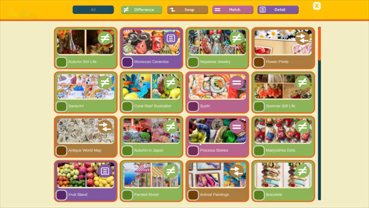 โหมด “สลับ” เป็นปริศนาประเภทหนึ่งที่คุณต้องจัดเรียงชิ้นส่วนเพื่อสร้างเป็นรูปภาพ มาพร้อมกับรูปภาพสูงสุดห้ารูป สลับส่วนระหว่างรูปภาพเพื่อทำให้รูปภาพสมบูรณ์ รูปภาพบางรูปอาจซับซ้อนมากและต้องอาศัยการคาดเดาในบางครั้ง ปัญหาเล็ก ๆ เพียงอย่างเดียวที่ฉันมีในโหมดนี้คือไม่มีความแตกต่างเพียงพอระหว่างแผ่นกระเบื้องที่คุณเปลี่ยนสำเร็จกับแผ่นกระเบื้องที่ยังหาตำแหน่งไม่พบ ในที่สุดเราก็มีโหมด “รายละเอียด” แนวคิดที่ผมไม่เคยเห็นมาก่อนในเกมประเภทนี้ คุณจะเห็นรูปภาพและด้านล่างมีรูปภาพบางส่วนที่คุณต้องการค้นหา