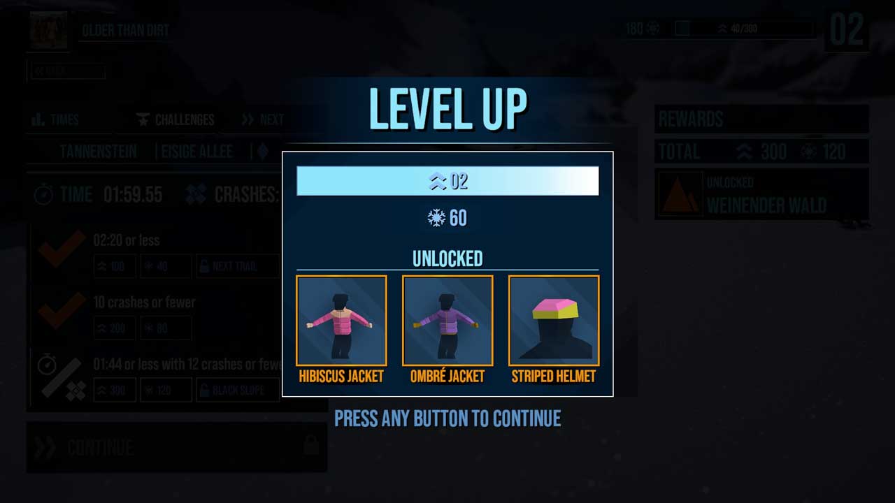 ในแต่ละภารกิจที่คุณทำสำเร็จ คุณจะได้รับค่าประสบการณ์สำหรับการเพิ่มเลเวล รวมถึงเงินสำหรับใช้ในร้านค้าเครื่องสำอาง (เฉพาะในเกมเท่านั้น) ภารกิจในโหมดเดี่ยวจะเพิ่มเป็น 25 ภารกิจ และการทำภารกิจเส้นทางนี้ให้สำเร็จจะปลดล็อกการแข่งขันออนไลน์ สกีพิเศษทั้ง 4 แบบ ทริคในการจับวัตถุ และไอเทมเครื่องสำอางให้ซื้อมากขึ้น