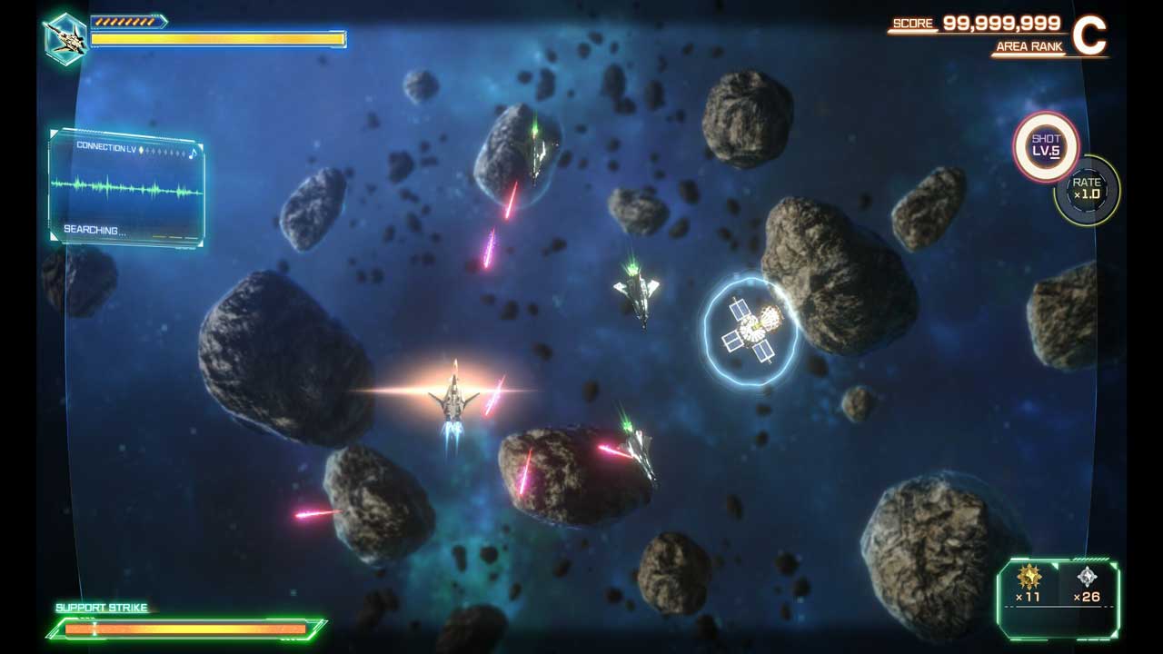เช่นเดียวกับชื่ออื่น ๆ ในเกมนี้ คุณจะยิงขีปนาวุธหลักและรองใส่ศัตรูที่เข้ามาใกล้จากขอบของหน้าจอ (โดยปกติจะมาจากฝั่งตรงข้าม) ในขณะที่หันเหกระสุนออกไป อาวุธของนักสู้แต่ละคนจะถูกขับเคลื่อนโดยการเก็บคริสตัลที่ศัตรูทิ้งไว้ และมิสไซล์จะมีตัวทวีคูณซึ่งจะเพิ่มขึ้นตามจำนวนศัตรูที่คุณฆ่าในการระดมยิงแต่ละครั้ง ทั้งหมดนี้ค่อนข้างเป็นมาตรฐานสำหรับเกมประเภทนี้ แต่เกมนี้ยังมีปุ่มหลบที่ให้คุณหลบการโจมตีโดยไม่ได้รับความเสียหาย