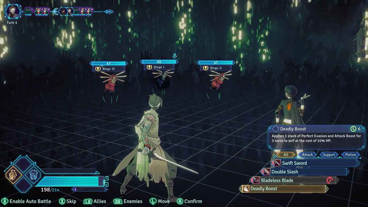 ในความเป็นจริง รูปแบบการเล่นหลักของเกมแบ่งออกเป็นสองส่วน: ในโลกพื้นผิวของเกม คุณควบคุม “Doe” และเคลื่อนไหวอย่างอิสระในเมือง พูดคุยกับผู้คนและรับภารกิจเสริม และผ่านสิ่งนี้ คุณพัฒนาโครงเรื่อง ในโลกภายในที่คุณเล่นเป็นตัวละคร “Gram” โลกนี้ประกอบด้วยเขาวงกตที่เรียกว่าถ้ำและเป็นที่เดียวที่คุณสามารถต่อสู้กับสัตว์ประหลาดได้ ภารกิจในเกมจะแบ่งออกเป็นสายย่อยและสายหลัก โดยที่เครื่องหมายอัศเจรีย์สีแดงคู่หมายถึงสายหลัก และเครื่องหมายอัศเจรีย์สีเหลืองเดี่ยวหมายถึงสายย่อย ในการต่อสู้แบบผลัดกันเล่น พลังชีวิตของทีมจะถูกแบ่งปันและความเสียหายประเภทต่างๆ จะสวนทางกัน การเปลี่ยนอาวุธสามารถเปลี่ยนคุณสมบัติความเสียหายของทักษะระดับ A ได้ แต่ทักษะของตัวละครแต่ละตัวจะไม่เปลี่ยนแปลง