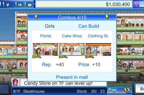 ตามเนื้อเรื่อง เมื่อพิจารณาว่าเป็นเกม Kairosoft บางทีอาจขึ้นอยู่กับลักษณะการดำเนินงานของห้างสรรพสินค้าในญี่ปุ่น โดยส่วนตัวแล้ว ไม่ ฉันเชื่อว่าการลงทุนในศูนย์การค้าอาจมีผลกำไรมากกว่าบาสเก็ตบอล นอกจากนี้ ฉันไม่เคยเห็นว่าเราสามารถมีผู้ซื้อขาประจำในห้างสรรพสินค้าของเราได้ และเกมนี้ดูเหมือนว่าจะมีพื้นฐานมาจากวัฒนธรรมญี่ปุ่นที่แตกต่างกัน และอาจกล่าวได้ว่าทำงานได้ดีกว่าเกม “การจัดการสถานที่” อื่น ๆ ของผู้พัฒนามาก มีของตัวเอง เกมนี้เปิดตัวสำหรับอุปกรณ์พกพาในปี 2554 และได้รับการพอร์ตไปยังพีซีในปี 2565 อีกด้วย ในที่สุดก็จะเปิดตัวสำหรับคอนโซลรุ่นใหม่อื่นๆ ในเดือนกุมภาพันธ์ 2024