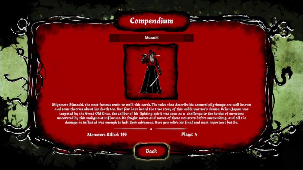 เกม Musashi vs Cthulhu เป็นเกมอิสระที่มีรูปแบบการเล่นที่รวดเร็วในรูปแบบของเกม Beat ’em up ซึ่งผสมผสานเรื่องราวของโลก Lovecraft เข้ากับโลกแห่งซามูไร และแม้ว่าผลิตภัณฑ์ขั้นสุดท้ายดูเหมือนจะประสบปัญหาในขั้นตอนการนำไปใช้งาน . แต่ยังสามารถให้ความบันเทิงได้มากในช่วงสั้นๆ เกมนี้เป็นอัญมณีที่แท้จริง มันยากและไม่ยอมให้อภัย แต่มันต้องใช้ทักษะเป็นหลัก ไม่มีโชคหรือโชคร้าย มันตอบแทนประสบการณ์และปฏิกิริยาของคุณ ทุกครั้งที่คุณล้มเหลว คุณทำได้แต่โทษตัวเองและเรียนรู้สิ่งใหม่ๆ จากความผิดพลาดของคุณ อย่างไรก็ตาม มันไม่น่าเบื่อเลยสำหรับผู้ทำคะแนนสูง มันสนุกมากจนคุณไม่รู้สึกถึงความล้มเหลว คุณแค่เล่นต่อไปซ้ำแล้วซ้ำอีกเพราะรูปแบบการเล่นมีความไดนามิกและน่าติดตามจนคุณหยุดไม่ได้