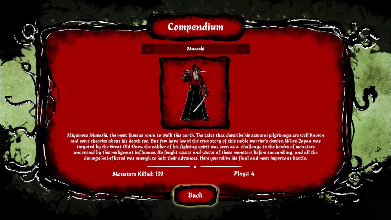 เกม Musashi vs Cthulhu เป็นเกมอิสระที่มีรูปแบบการเล่นที่รวดเร็วในรูปแบบของเกม Beat ’em up ซึ่งผสมผสานเรื่องราวของโลก Lovecraft เข้ากับโลกแห่งซามูไร และแม้ว่าผลิตภัณฑ์ขั้นสุดท้ายดูเหมือนจะประสบปัญหาในขั้นตอนการนำไปใช้งาน . แต่ยังสามารถให้ความบันเทิงได้มากในช่วงสั้นๆ เกมนี้เป็นอัญมณีที่แท้จริง มันยากและไม่ยอมให้อภัย แต่มันต้องใช้ทักษะเป็นหลัก ไม่มีโชคหรือโชคร้าย มันตอบแทนประสบการณ์และปฏิกิริยาของคุณ ทุกครั้งที่คุณล้มเหลว คุณทำได้แต่โทษตัวเองและเรียนรู้สิ่งใหม่ๆ จากความผิดพลาดของคุณ อย่างไรก็ตาม มันไม่น่าเบื่อเลยสำหรับผู้ทำคะแนนสูง มันสนุกมากจนคุณไม่รู้สึกถึงความล้มเหลว คุณแค่เล่นต่อไปซ้ำแล้วซ้ำอีกเพราะรูปแบบการเล่นมีความไดนามิกและน่าติดตามจนคุณหยุดไม่ได้