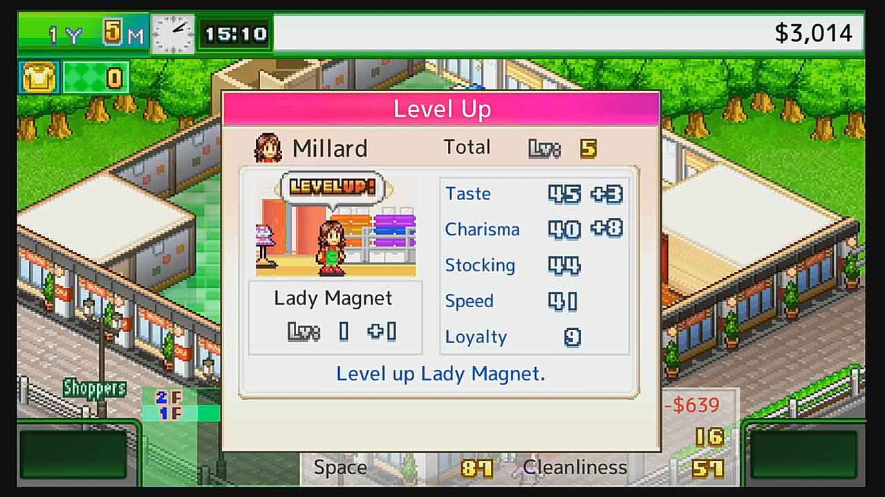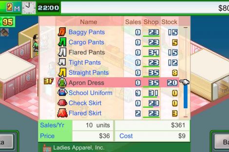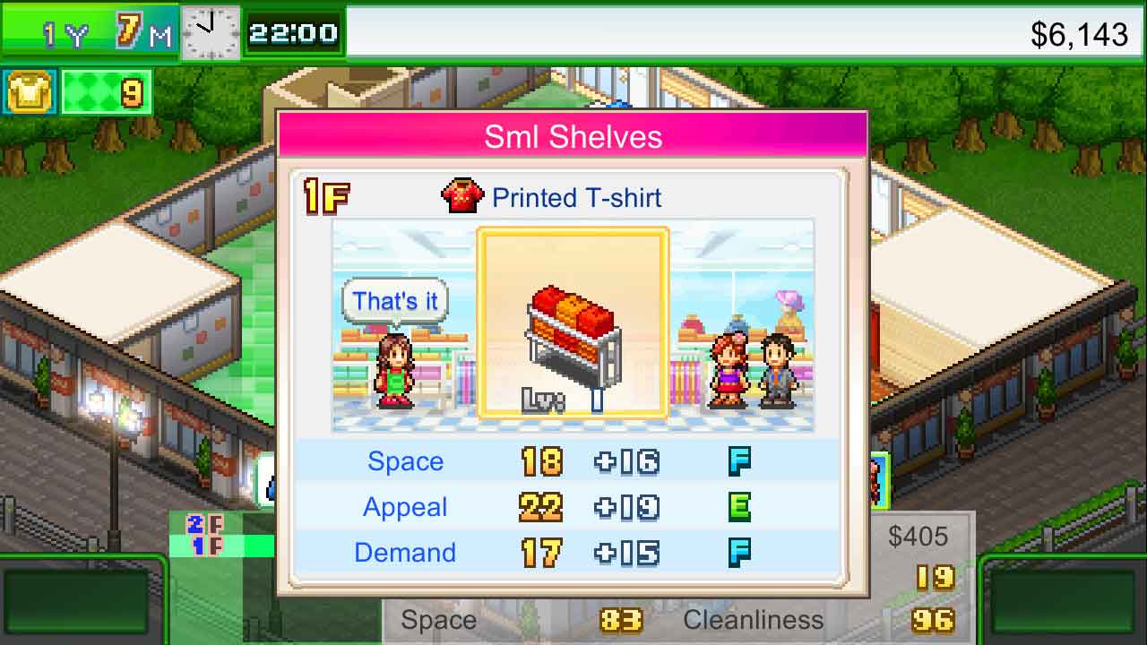 ระบบความเข้ากันได้แบบดั้งเดิมของเกม Kairosoft นั้นอยู่ที่จำนวนการจับคู่เสื้อผ้า ผู้เล่นยังสามารถเพิ่มระดับความพึงพอใจในบริษัทเสื้อผ้าได้ด้วยการขายเสื้อผ้าจำนวนหนึ่งเพื่อปลดล็อคเสื้อผ้าประเภทต่างๆ มากขึ้น และด้วยวิธีนี้ เสื้อผ้าประเภทต่างๆ จะถูกกระจายไปตามพื้นที่ต่างๆ ของห้างสรรพสินค้ามากขึ้น การปลดล็อคชุดใหม่ต้องใช้คะแนนชุด ซึ่งเป็นตัวบ่งชี้ทรัพยากรที่สำคัญมากในเกมนอกเหนือจากเงิน