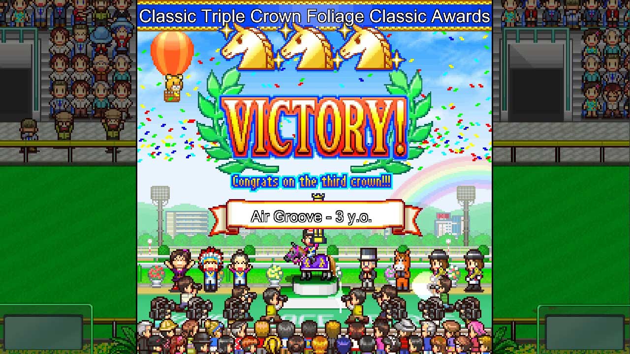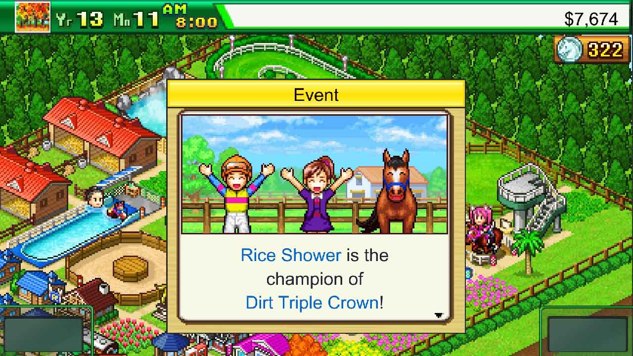 หากคุณไปถึง G1 คว้าทริปเปิลคราวน์ และในตอนจบเกม คุณสามารถพิชิตความท้าทายทั้งหมดได้ ระดับความยากสูงมาก จึงต้องอาศัยการฝึกฝนอย่างมาก คุณต้องฝึกและแข่งม้าแข่งเพื่อให้ได้รับความนิยมและรวบรวมแฟน ๆ ในฟาร์มของคุณให้ได้มากที่สุด! แม้ว่าม้าจะแข่งเหมือนม้าแข่ง แต่ก็สามารถเพาะพันธุ์เพื่อผลิตเมล็ดพันธุ์ได้ ฉากการแข่งมีพลังและน่าสนใจมากและมีความแตกต่างจากการแข่งม้าจริงและการจำลองฟาร์ม