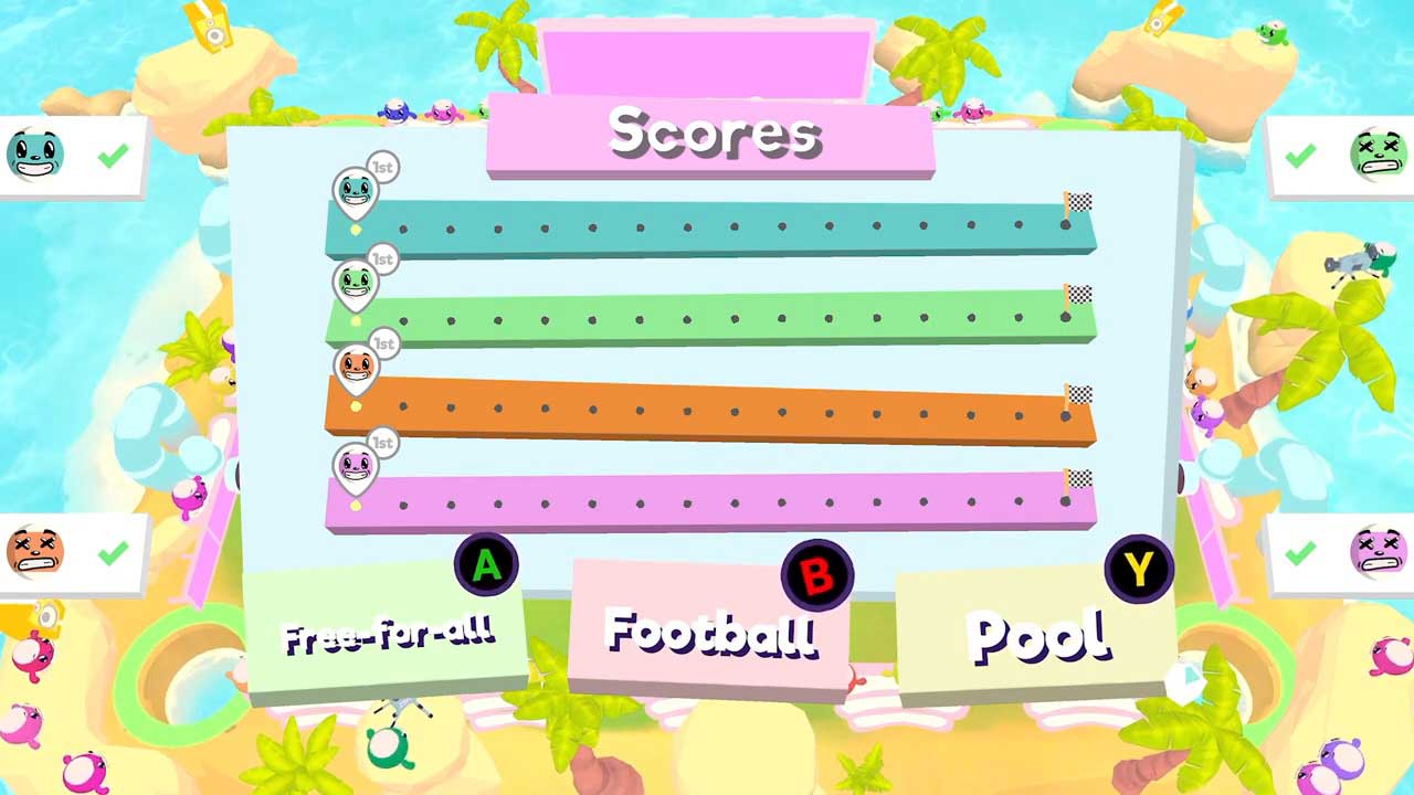 ฉันได้รับ Pool Party เวอร์ชันตัวอย่างมารีวิวแล้ว และในขณะที่ลองเล่น ฉันเลือกโหมดปาร์ตี้ที่คุณจะได้รับมินิเกมหลายเกมติดต่อกัน หลังจากแต่ละเกม คุณสามารถโหวตว่าเกมใดที่คุณต้องการเล่นในรอบถัดไป หรือให้เกมเลือกเกมหนึ่งให้กับคุณ หลังจากแต่ละเกม คุณจะได้รับคะแนนขึ้นอยู่กับว่าคุณทำได้ดีแค่ไหนในเกม (3 คะแนนสำหรับอันดับที่ 1, 2 คะแนนสำหรับอันดับที่สอง ฯลฯ) และจะเพิ่มเป็นมูลค่าคะแนน ผู้เล่นคนแรกที่เข้าถึงจำนวนนี้จะเป็นผู้ชนะเกม นอกจากนี้ยังสามารถเล่นกับเพื่อน ๆ หรือเพิ่มบอทที่มีระดับความยากต่างกันในเกมได้