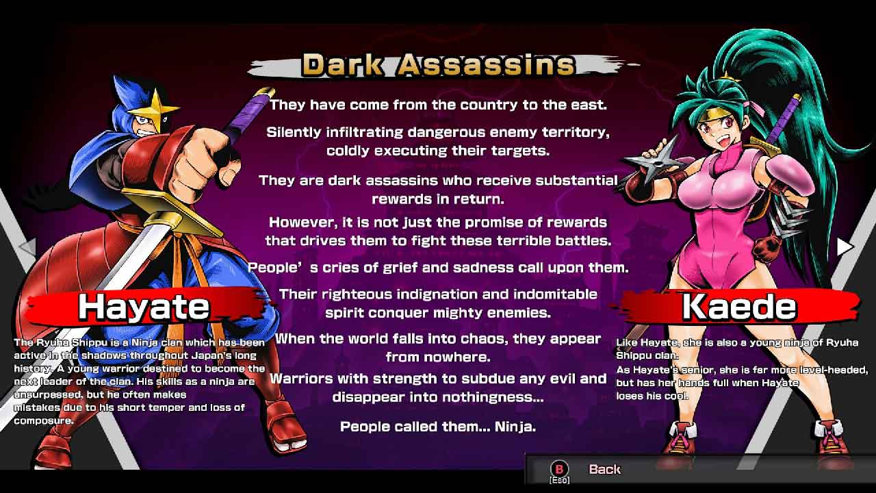 เรื่องราวของเกมนี้เกิดขึ้นในปี 2029 และในอนาคตอันชั่วร้ายและดิสโทเปีย เราถูกส่งมาเป็นนินจาในตำนานฮายาเตะและคาเอเดะเพื่อลอบสังหารเผด็จการในเมืองแห่งอนาคตของนิวยอร์ก เพื่อให้บรรลุเป้าหมายนี้ เราต้องต่อสู้ผ่านหกด่านเพื่อเข้าถึงเขา โดยมีระดับที่ยากขึ้นเรื่อยๆ และยากขึ้นในการเอาชีวิตรอด