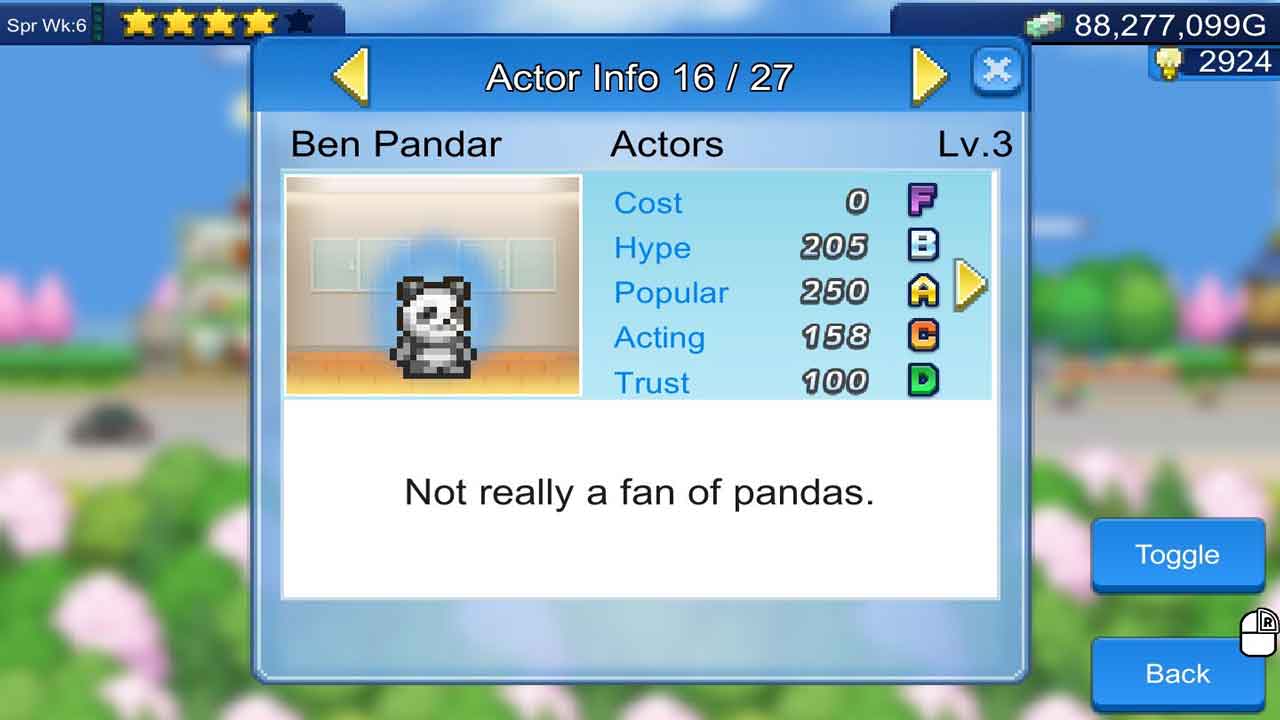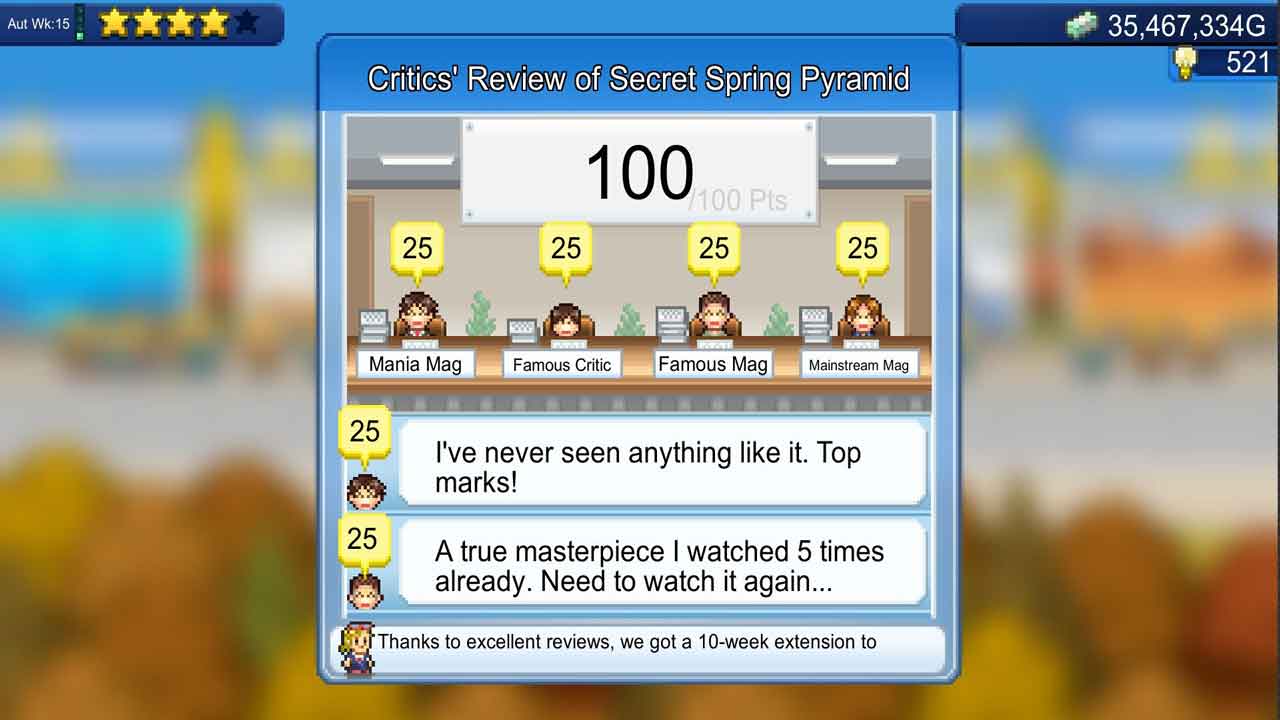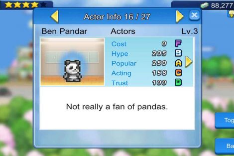 ตัวเกมเองให้อิสระในระดับสูง และเป็นวิธีฆ่าเวลาที่ดีเยี่ยม ถึงแม้จะเป็นมินิเกมแบบพิกเซล แต่มันก็ไม่ได้รู้สึกแย่ (ยกเว้นอินเทอร์เฟซแบบเก่า ซึ่งยอมรับว่าค่อนข้างแย่) แต่มันก็ยังสนุกมาก อีกอย่างที่ผมชอบเกี่ยวกับเกมนี้ก็คือ คุณสามารถเปลี่ยนชื่อนักแสดงและผู้กำกับได้ โรงละครของผมจึงมีนักแสดงอย่าง William Powell และ Myrna Loy, Al Pacino, Sandra Bullock, Alfred Hitchcock และคนอื่นๆ ผมยังเคยให้ Jason Statham และ Steven Segal แสดงในหนังทุนต่ำ (เกือบจะ) ตรงที่ถ่ายทำระหว่างหนังทุนสูงของผม
