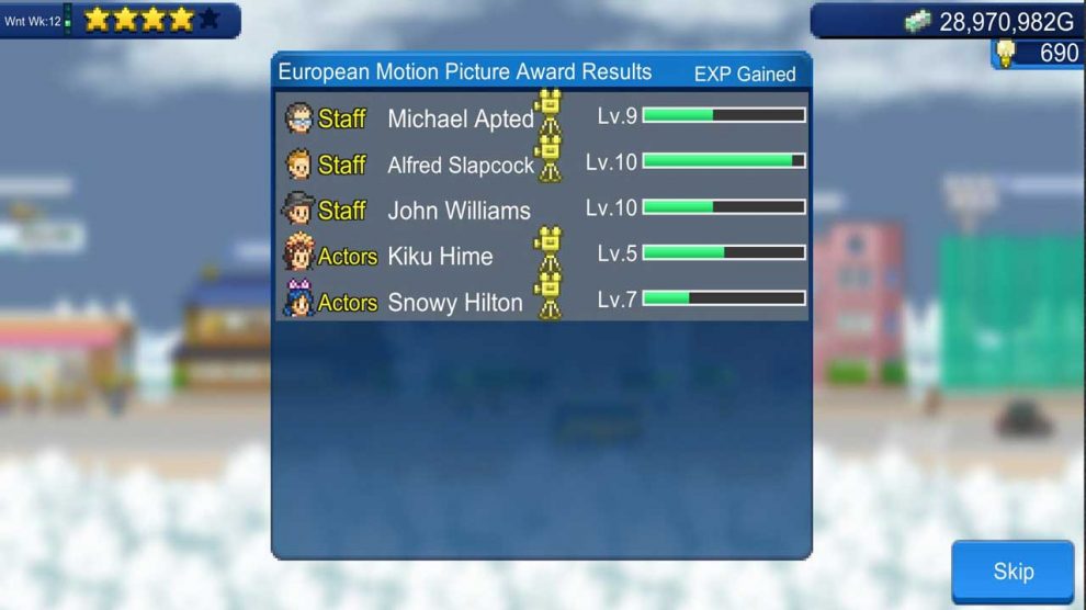 เมื่อคุณจ้างพนักงานที่สมัครงาน คุณจะได้รับงานสร้างฟรีจำนวนหนึ่ง อย่างไรก็ตาม เมื่อระดับพนักงานเพิ่มขึ้น ไม่เพียงแต่สถานะของพวกเขาเท่านั้น แต่ค่าใช้จ่ายของพวกเขาก็เพิ่มขึ้นด้วย ดังนั้น การแทนที่พวกเขาด้วยพนักงานระดับ 1 (ถ้ามี) หลังจากถึงระดับที่กำหนดจะช่วยลดต้นทุนการผลิตได้ (แม้ว่าอาจทำให้คุณภาพโดยรวมของภาพยนตร์ลดลงก็ตาม) เมื่อคุณเริ่มมีรายได้ คุณสามารถลงทุนในข้อตกลงกับโรงภาพยนตร์ เพิ่มสิ่งอำนวยความสะดวกใหม่ๆ ในสตูดิโอของคุณ และเปิดสถานที่ถ่ายทำใหม่ๆ เพื่อผลิตภาพยนตร์ที่ใหญ่ขึ้นและดีขึ้น