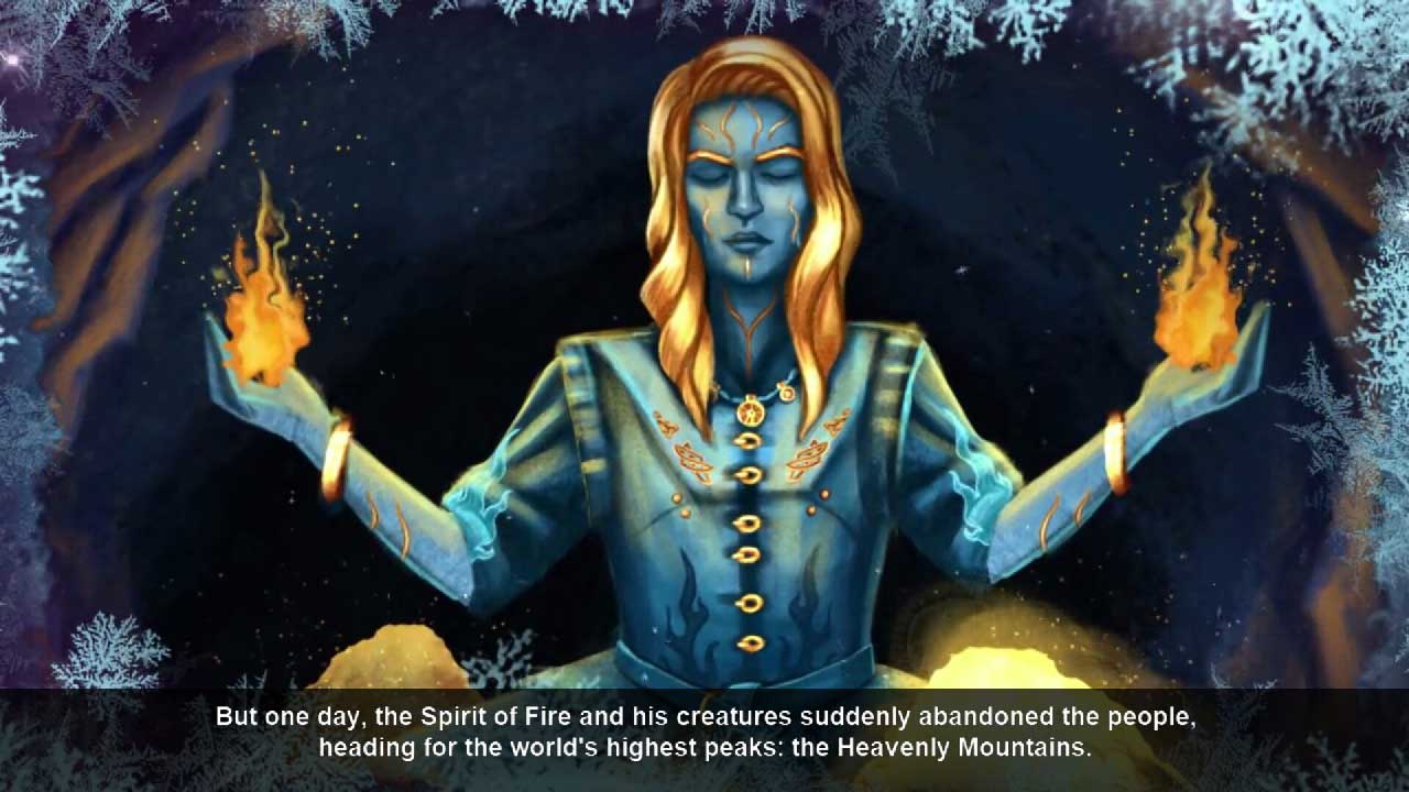 เช่นเดียวกับเกมหาของบางเกม มีเรื่องราวให้เล่าที่นี่ ซึ่งไม่ใช่เรื่องใหม่และไม่จริงจังเกินไป เรื่องราวได้รับการบอกเล่าอย่างดีสำหรับเกมหาของ แต่ตามปกติแล้วคุณไม่ควรคาดหวังปาฏิหาริย์ที่นี่ เรื่องราวของเกม Spirits Chronicles: Born in Flames เริ่มต้นขึ้นเมื่อนานมาแล้ว ผู้คนในอาณาจักรทางตอนเหนือของ Wintersea อาศัยอยู่ร่วมกับวิญญาณแห่งไฟ Arcanius เพื่อเป็นการขอบคุณสำหรับของขวัญและการเสียสละ วิญญาณแห่งไฟทำให้บ้านของพวกเขาอบอุ่นและทำให้ชีวิตมีความสุขมากขึ้นด้วยเปลวไฟ แต่แล้ววันหนึ่งอาร์คาเนียสก็หันหลังหายตัวไปบนภูเขาสวรรค์ สิ่งนี้เปลี่ยนชีวิตผู้คนและสัตว์ให้แย่ลง ชีวิตกลายเป็นความรุนแรงและความหนาวเย็นแผ่ซ่านไปทั่วทุกแห่ง