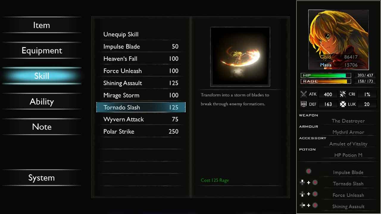 นอกจากนี้ ส่วนการต่อสู้ยังใช้ความสามารถพิเศษที่ต้องใช้คุณสมบัติ Rage ซึ่งสามารถรวบรวมได้เมื่อจัดการกับศัตรูและสร้างความเสียหายให้กับพวกเขา สิ่งเหล่านี้เป็นการโจมตีที่ทรงพลังที่สามารถปลดล็อคได้ในหน้าจอความสามารถ สามารถเลือกการโจมตีพิเศษได้ครั้งละหนึ่งการโจมตี ดังนั้นคุณควรเลือกการโจมตีที่เหมาะกับสไตล์การเล่นของคุณมากที่สุด ศัตรูส่วนใหญ่รวดเร็วและมีความเร็วในการดำเนินการสูง พวกมันอันตรายอย่างยิ่งในการโจมตีแบบกลุ่ม เพราะศัตรูในระยะไกลจะซ่อนตัวอยู่หลังพันธมิตรที่มีเกราะกำบัง และยิงคุณโดยไม่ต้องกลัวการตอบโต้ พวกมันเร็วและคุณต้องเร็วกว่าพวกมัน ใช้การหลบแล้วกระโดดเสมอ (การกระโดดสองครั้งสามารถปลดล็อคได้ในความสามารถของเว็บ) เพื่อหลีกหนีจากอันตราย ศัตรูแต่ละคนมีวิธีการฆ่าของตัวเอง และในที่สุดคุณก็จะค้นพบวิธีจัดการกับพวกเขาให้ดีที่สุด บอสส่วนใหญ่เป็นความท้าทายในการต่อสู้ สัตว์ประหลาดยักษ์เหล่านี้มีแถบพลังชีวิตหลายชั้นและสามารถทำร้ายคุณได้ มอนสเตอร์ทั้งหมดเหล่านี้มีวิธีฆ่าพวกมันโดยเฉพาะ ดังนั้นเมื่อคุณเข้าใจรูปแบบการโจมตีของพวกมันแล้ว พวกมันก็จะต่อสู้ได้ง่ายขึ้นเล็กน้อย แต่พวกมันจะดุร้ายขึ้นเมื่อแถบพลังชีวิตทุกอันที่คุณดรอป