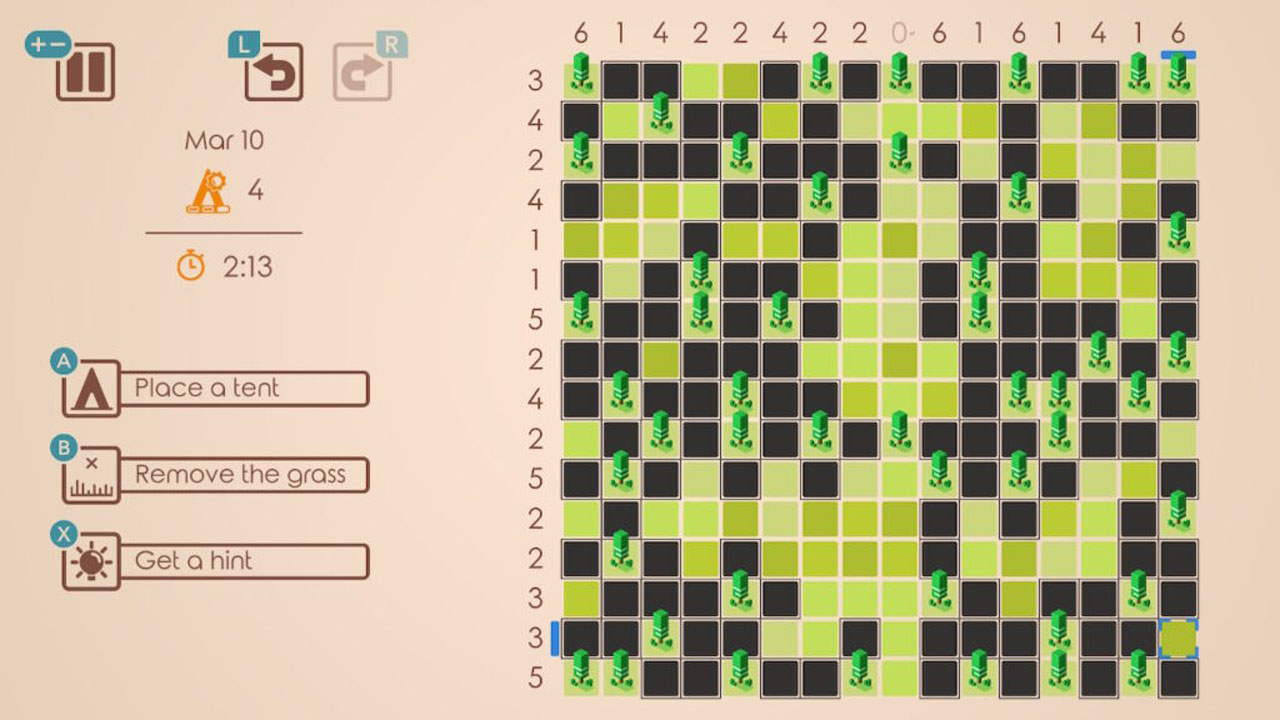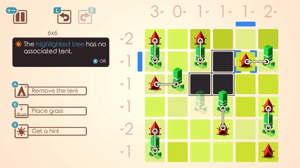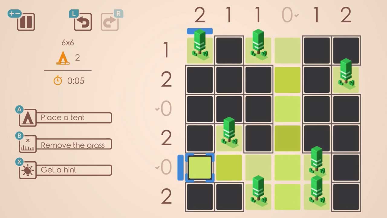 ต้องไม่วางต้นไม้ในแนวทแยงติดกัน และแต่ละต้นสามารถกางเต็นท์ได้หนึ่งหลังเท่านั้น สิ่งนี้อาจดูเหมือนง่ายที่จะทำ แต่เมื่อคุณดำเนินการผ่านเกมและเข้าถึงกริดที่ใหญ่ขึ้น คุณจะต้องใช้การอนุมานและการลองผิดลองถูกเล็กน้อยเพื่อให้งานสำเร็จลุล่วง ในความเป็นจริง เมื่อคุณเล่นเกมไปเรื่อย ๆ คุณจะพบกับกริดที่ใหญ่ขึ้นและระดับที่ท้าทายมากขึ้น ซึ่งคุณจะต้องคิดกลยุทธ์ของคุณเอง คุณยังสามารถติดตั้งเกมนี้บนโทรศัพท์มือถือของคุณ แต่เกมนี้เป็นเกมแรกที่เปิดตัวสำหรับคอนโซล Nintendo Switch และฉันสามารถพูดได้ว่ามันเหมาะสมอย่างยิ่งสำหรับคอนโซลนี้และได้รับการปรับแต่งอย่างเต็มที่ และมีพอร์ตที่ยอดเยี่ยมสำหรับรุ่นมือถือ . นอกจากนี้ เกมนี้มีโหมดผู้เล่นหลายคนในพื้นที่ซึ่งผู้เล่นสูงสุด 4 คนสามารถทำงานร่วมกันเพื่อไขปริศนา