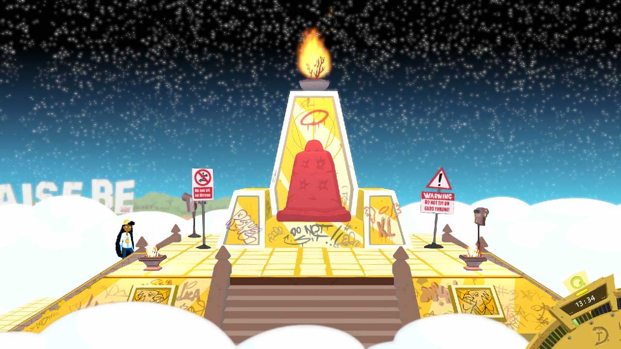 คุณเล่นเป็น Cassiel นางฟ้าในสวรรค์ที่ไม่มีอะไรให้ทำมากนักแต่ตอนนี้ติดอยู่ในห้วงเวลาและทำภารกิจกอบกู้สวรรค์ เขามักจะใช้เวลาส่วนใหญ่นั่งอยู่บนม้านั่งในสวนสาธารณะกับเพื่อนของเขา และคาดเดาว่าสุนัขตัวไหนจะได้ไปสวรรค์ต่อไป มนุษย์แทบจะไม่สามารถมาที่นี่ได้ แต่ “All Dogs Go to Heaven” ซึ่งฉันเชื่อว่าเป็นการพาดพิงถึงการ์ตูนเรื่อง Charlie – All Dogs Go to Heaven ในปี 1989 ไม่ว่าในกรณีใด จู่ๆ สุนัขก็หายไปและฝูงวิญญาณชั่วร้ายก็บุกสวรรค์ สิ่งนี้นำไปสู่การระเบิดที่ทำลายทุกสิ่งอย่างรวดเร็ว ในสถานการณ์เช่นนี้ หน้าที่ของเราคือป้องกันการล่มสลายของสวรรค์ (และนรก) โดยพื้นฐานแล้วคุณเป็นคนตลก คุณต้องสัมผัสมัน