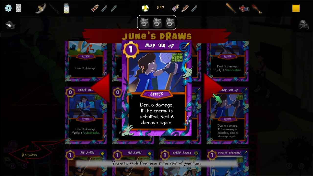 อย่างที่เราพูด Last Kids on Earth: Hit the Deck เป็นเกมการ์ดวางแผนผลัดกันเล่นเป็นทีมที่มีภารกิจมากกว่า 30 ภารกิจตามเรื่องเล่าในซีรีส์นวนิยายเรื่องนี้ ในการต่อสู้ของเกม คุณต้องใช้การ์ดที่ไม่ซ้ำกัน 60 ใบสำหรับตัวละครแต่ละตัวที่สามารถใช้สำหรับการโจมตี การป้องกัน หรือการทำงานเป็นทีม การ์ดเหล่านี้สร้างขึ้นตามความสามารถพิเศษของตัวละครแต่ละตัว ซึ่งแต่ละการ์ดจะมีเอฟเฟกต์ที่แตกต่างกันเมื่อ การต่อสู้แสดงตัวเอง ในการต่อสู้แต่ละครั้ง คุณสามารถเลือกตัวละครได้สูงสุดสองตัวสำหรับแต่ละภารกิจ ซึ่งจะทำเป็นเทิร์นและเทิร์นละสามแต้ม และคุณสามารถดูแต้มของการ์ดแต่ละใบได้ที่มุมซ้ายบนของภาพ