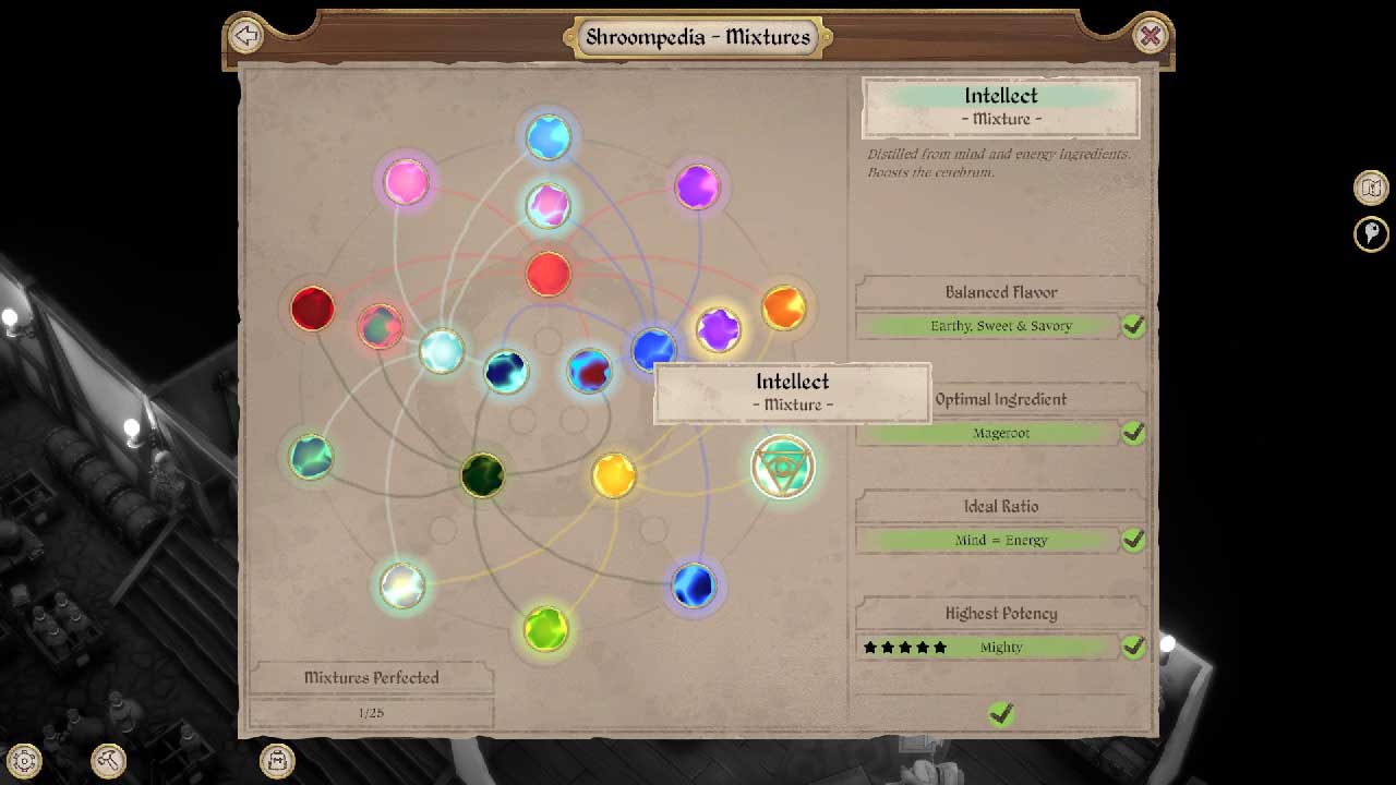 ในเกมเพลย์ของ The Magical Mixture Mill มีระบบ “สาระสำคัญ” ที่ซับซ้อนที่จะตัดสินว่ายาของคุณจะทำอะไร คุณสามารถผสมสารสกัดได้สูงสุด 3 ชนิดต่อยาแต่ละขวด รวมเป็นยาที่เป็นไปได้ทั้งหมด 25 ขวด ฉันชอบระบบนี้มากกว่าระบบโพติโอโนมิกส์มาก ซึ่งสีของมาจิมินดูไม่เป็นไปตามอำเภอใจ ในที่นี้หมายถึง เช่น “ชีวิต” “พลังงาน” และ “จิตใจ” (แน่นอนว่า การผสมผสานที่เฉพาะเจาะจงบางอย่างไม่สมเหตุสมผลนัก แต่ฉันสามารถผ่อนคลายได้เล็กน้อยเกี่ยวกับความจริงที่ว่าพวกมันจำเป็นต้องพอดีกับโครงสร้างที่เข้มงวดนี้) และแตกต่างจาก Potionomics ซึ่งส่วนใหญ่คุณต้องการค้นหาความบริสุทธิ์ที่ดีของสิ่งใด ๆ ชนิดของวัสดุที่แข็งแรงและใช้งานอยู่เสมอ